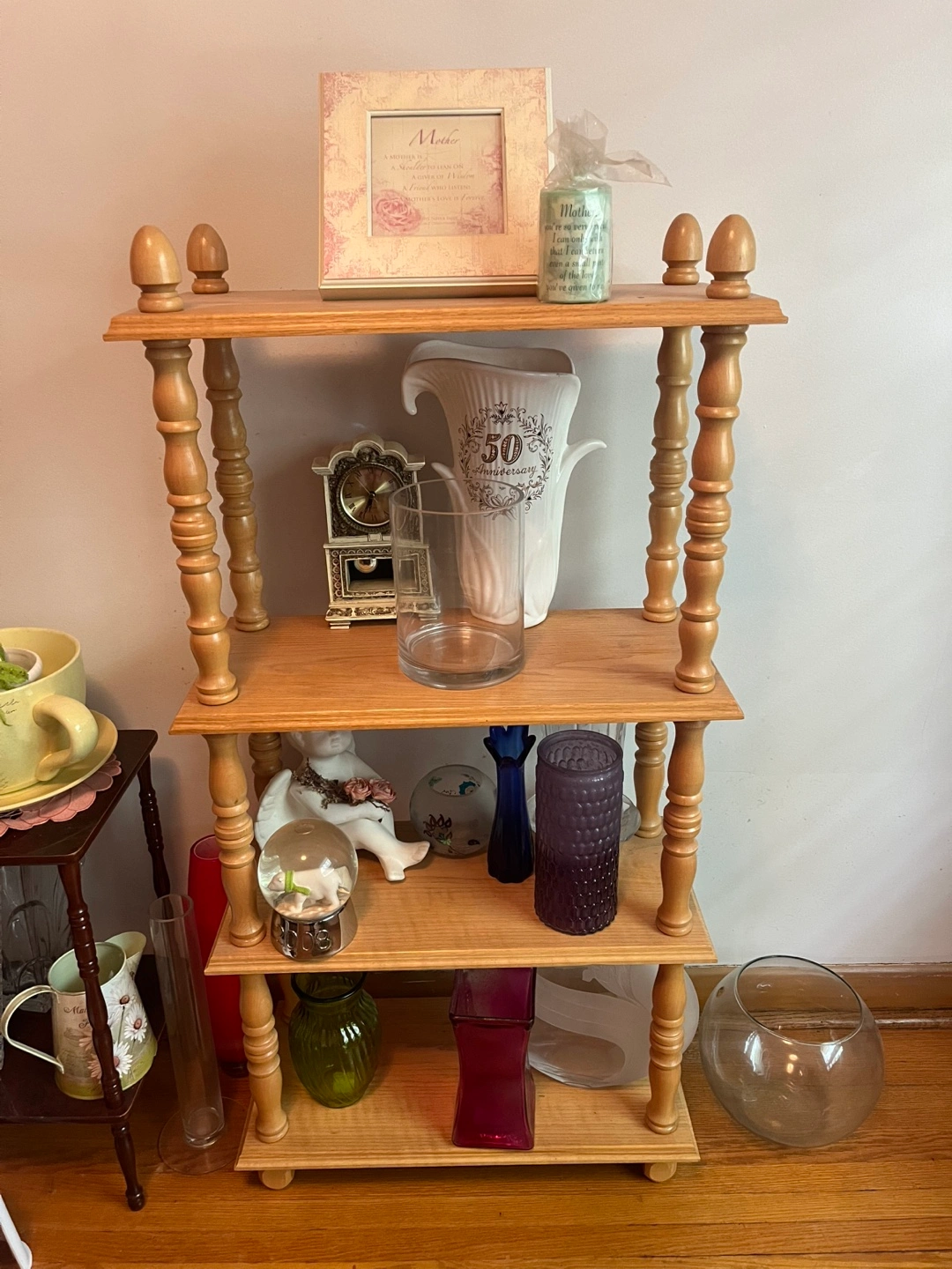 Selling a cute wooden shelf with three tiers! It's in great shape and perfect for displaying plants, books, or other decorative items. Would look great in any room!