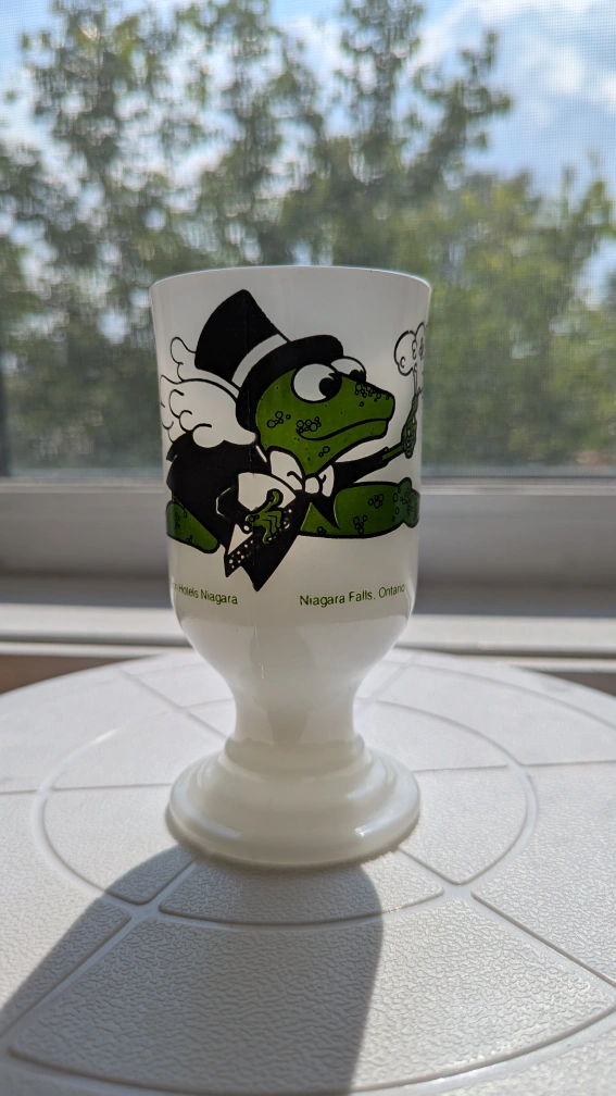 Selling a vintage milk glass souvenir mug featuring Froggie went a-courting from Sheraton Hotels Niagara Falls, Ontario! It's in great shape and the design is super cute. Perfect for collectors or anyone who loves a bit of nostalgia. 5.5 inches tall