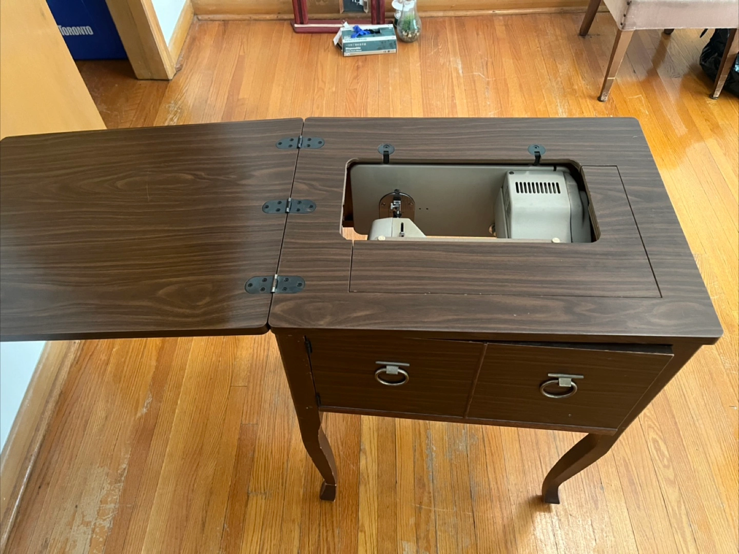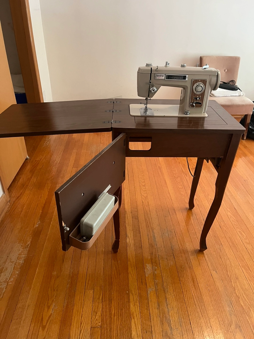 Selling a Brother sewing machine built into a lovely cabinet. It's in good condition. The cabinet provides a convenient space to store the machine and your sewing supplies.