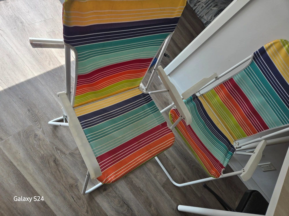 Selling a set of two striped folding beach chairs! They're perfect for lounging at the beach or relaxing in your backyard. The chairs are lightweight and easy to carry, making them ideal for outdoor adventures. They show some signs of use but are still in good condition for many sunny days to come