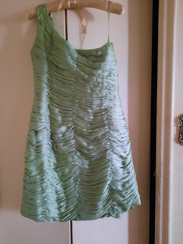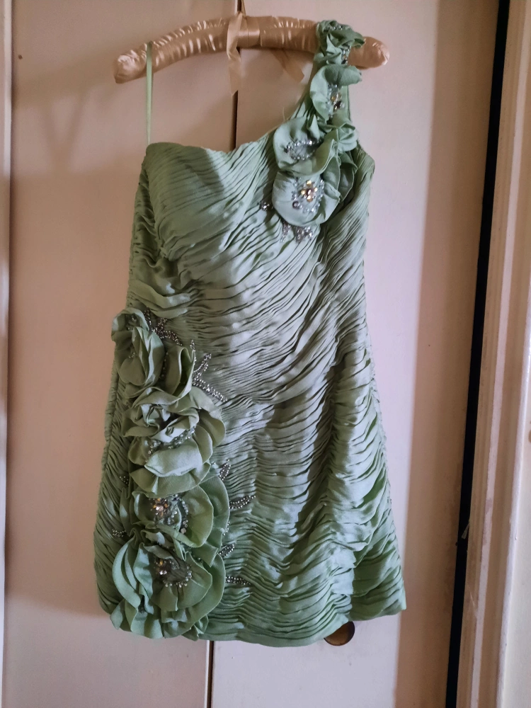 Selling a lovely green, one-shoulder dress. It features beautiful floral detailing and a unique design. Perfect for a special occasion!