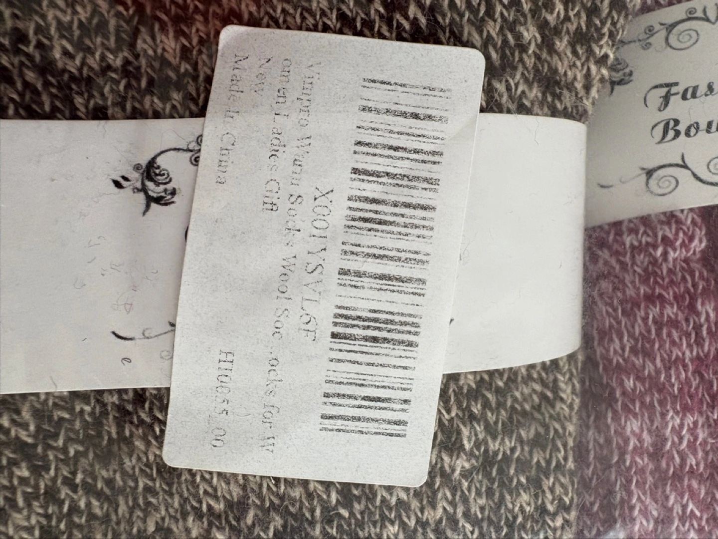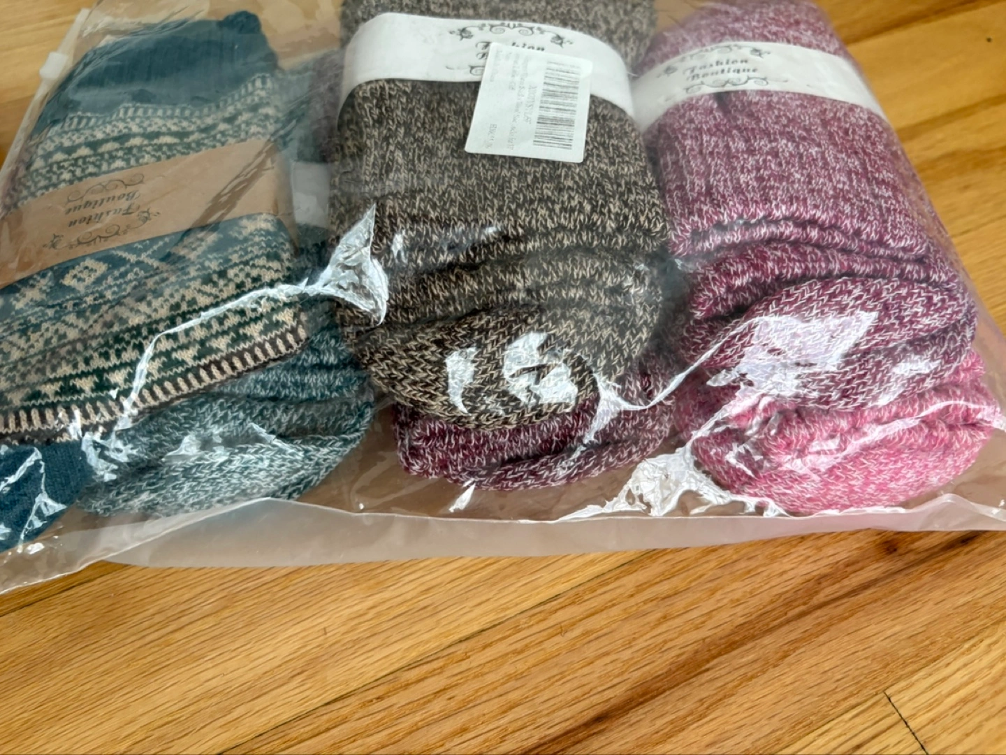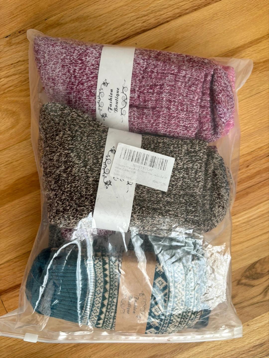 Here's a set of 6 pairs of cozy wool socks from Fashion Boutique! They're new and still in the original packaging, perfect for keeping your feet warm and stylish.