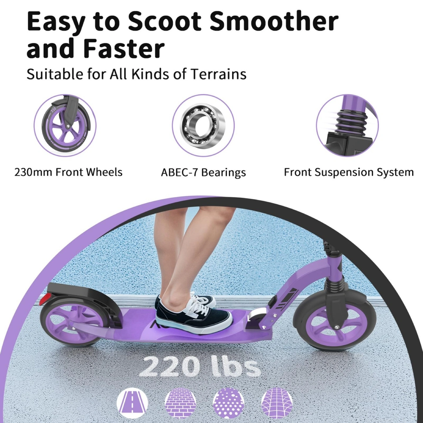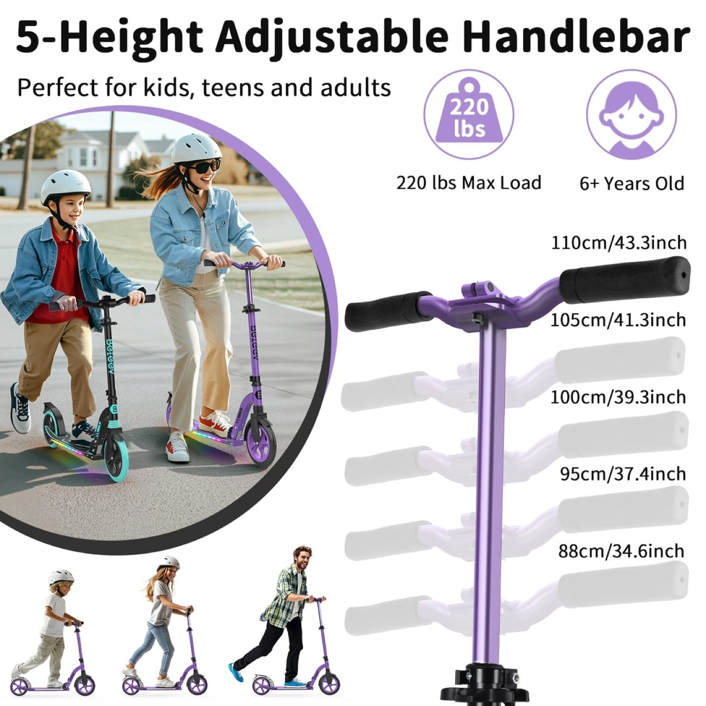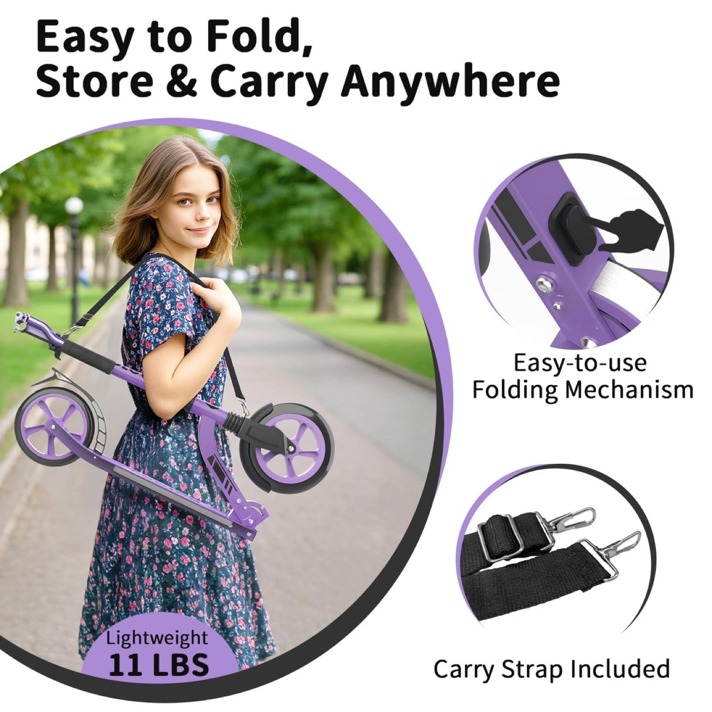 Wheel Folding Scooter for Adults Teens, 5 Adjustable Height, Lightweight Kick Scooter with Carry Strap, Up to 220 lbs