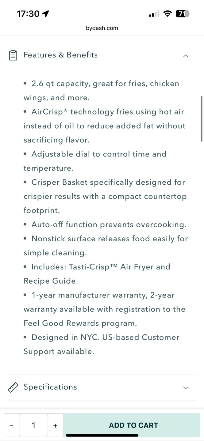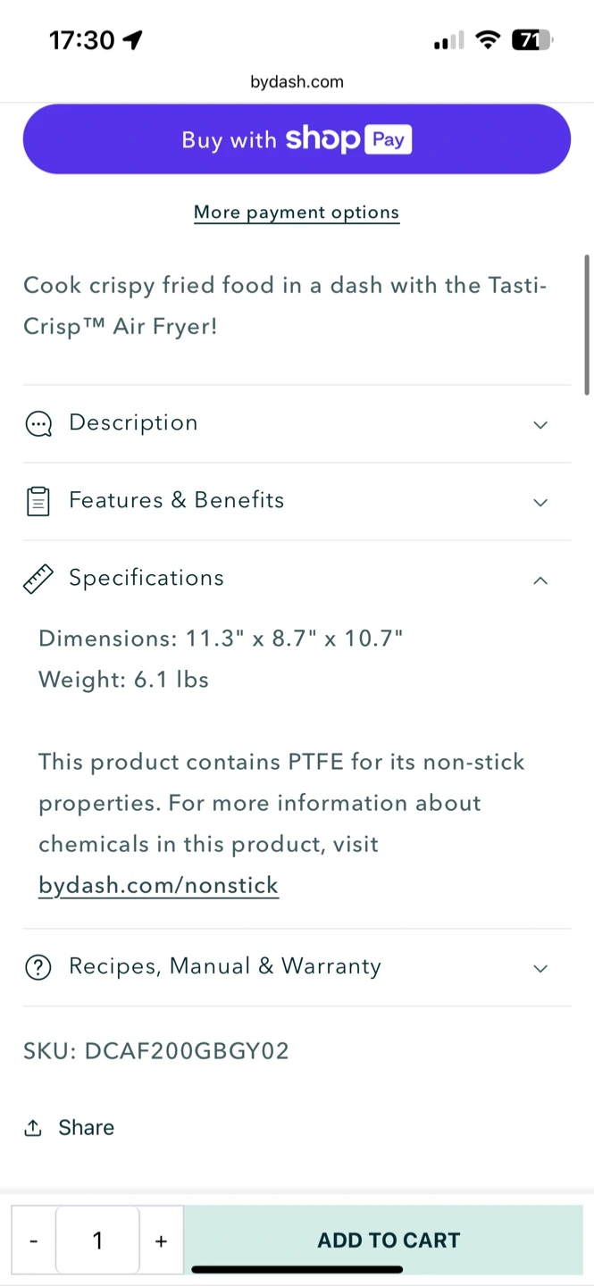 It has an adjustable dial to control time and temperature, and the crisper basket is specifically designed for crispier results with a compact countertop footprint. The dimensions are 11.3" x 8.7" x 10.7", and it weighs 6.1 lbs