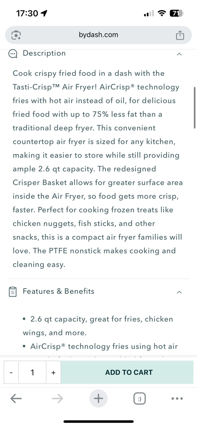 I'm selling a Tasti-Crisp Air Fryer with a 2.6 qt capacity. It's great for making fries, chicken wings, and more! It uses AirCrisp technology to fry using hot air instead of oil, which reduces added fat without sacrificing flavour.