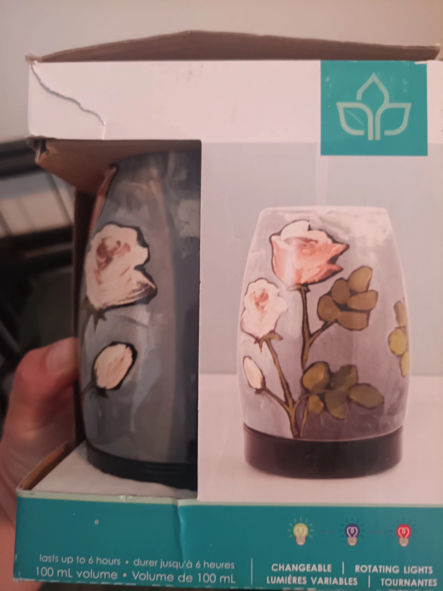 Selling an aroma diffuser that lasts up to 6 hours with a 100 ml volume. It features changeable and rotating lights. Box included