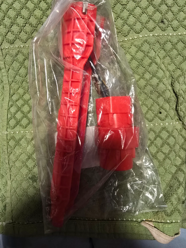 Selling a red plastic basin wrench, perfect for plumbing projects! It appears to be in new condition and comes in its original packaging with all components included. Great for getting into those hard-to-reach places under the sink