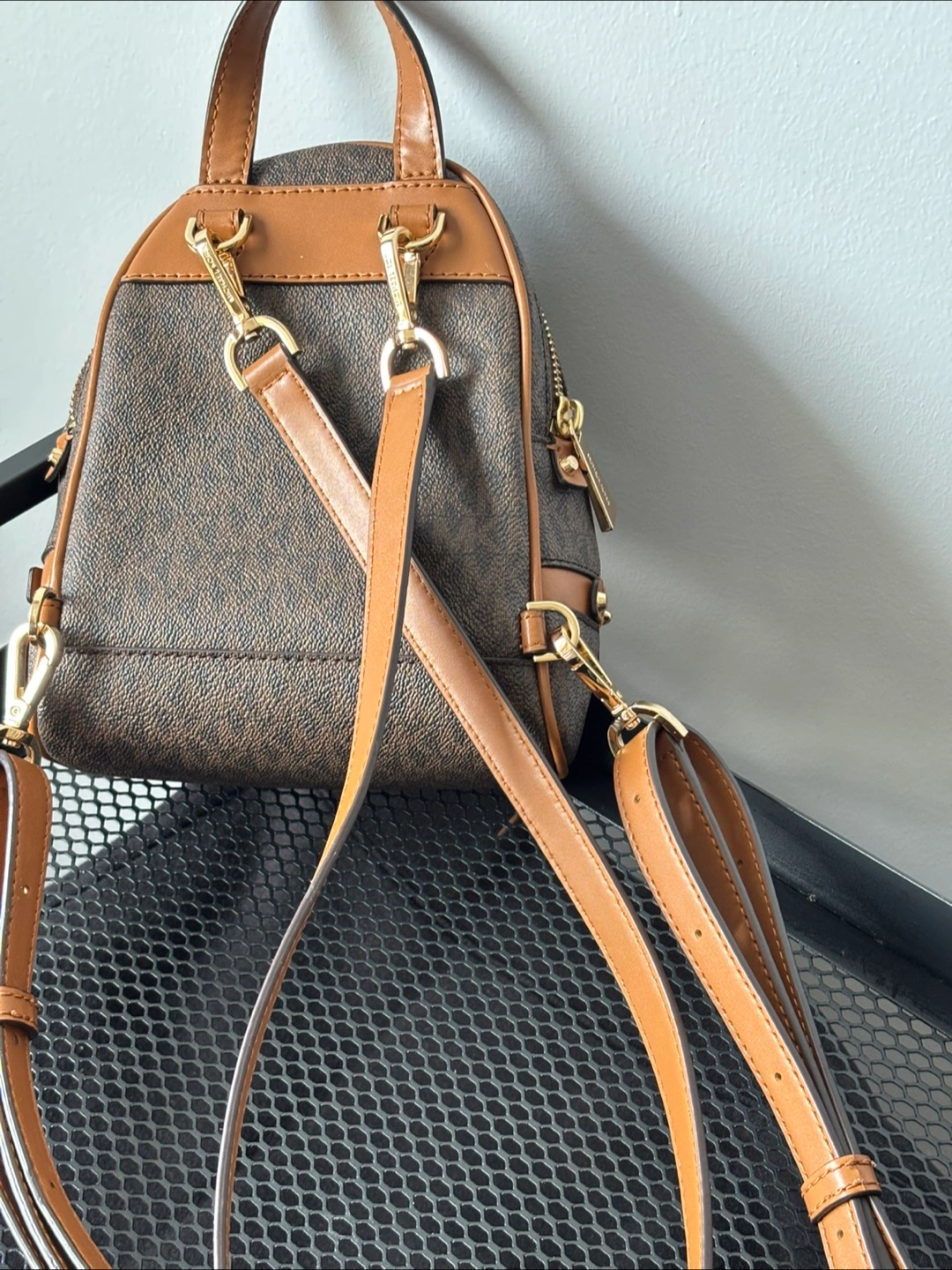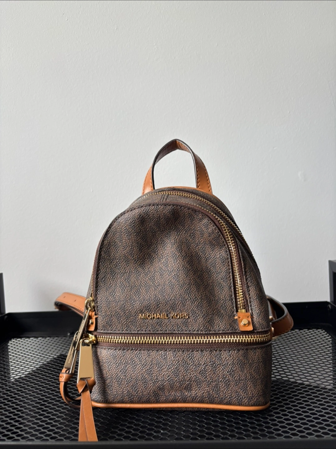 Selling a Michael Kors Rhea Mini Logo Backpack. It's in great condition and perfect for carrying your essentials while keeping your hands free. The backpack features the classic MK logo pattern and gold-tone hardware. It's a stylish and practical accessory for everyday use