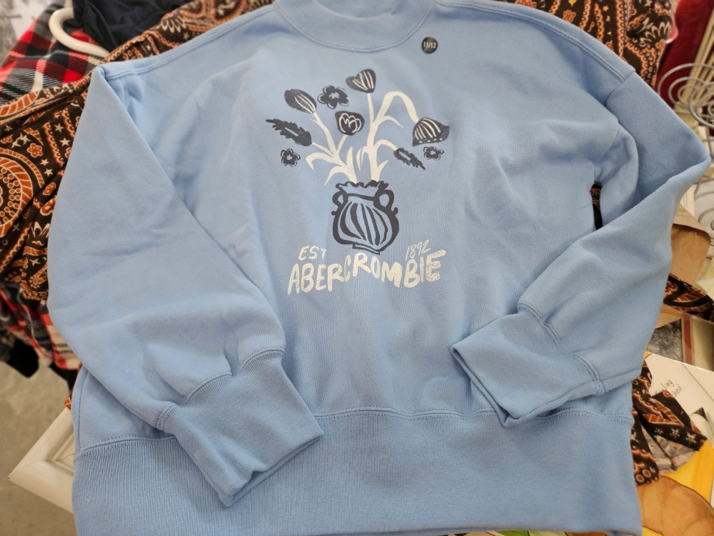 Selling a cute Abercrombie Kids sweatshirt in a lovely light blue colour! It's size 11/12 and features a fun floral design on the front. Perfect for keeping your little one cozy and stylish