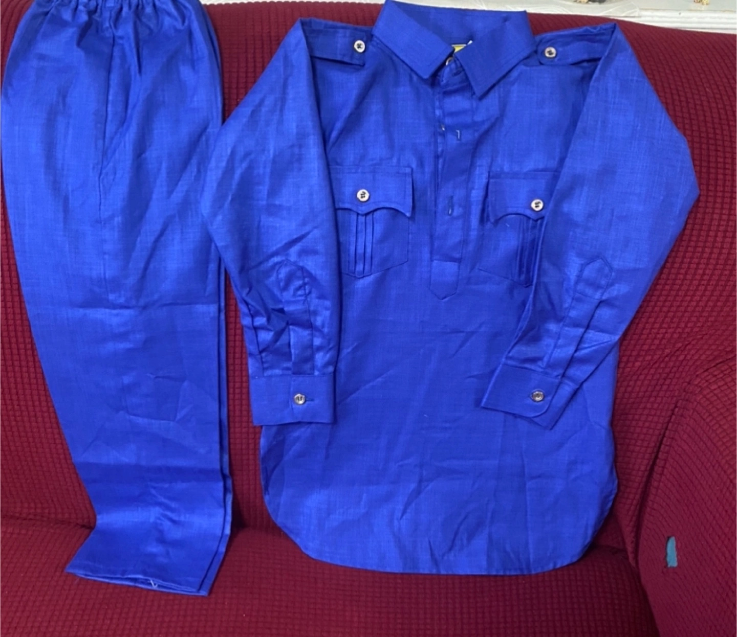 9A blue men's suit, perfect for a formal occasion! The suit includes a long-sleeved shirt with buttoned pockets and matching pants. It's in great condition and ready for a new home