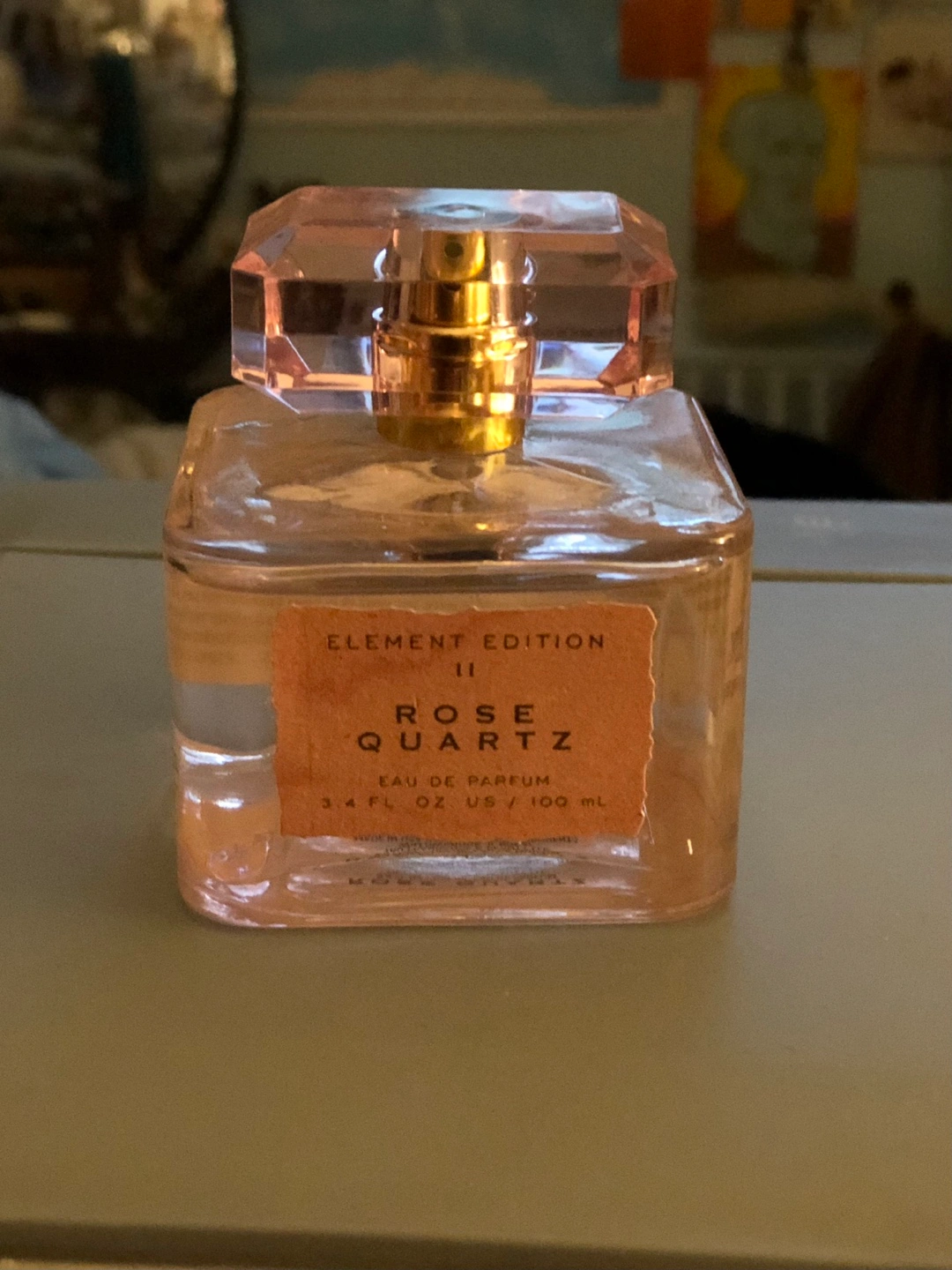 Selling a bottle of Element Edition Rose Quartz Eau de Parfum. It contains 3.4 fl oz / 100 ml. The sticker shows it was comparable at $25.00 and priced at $16.99. Only used once