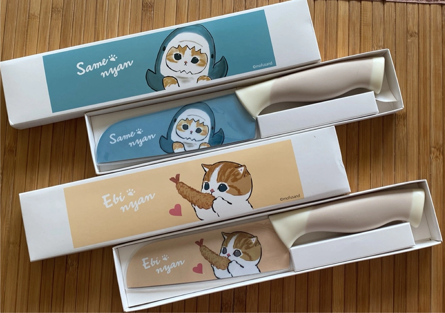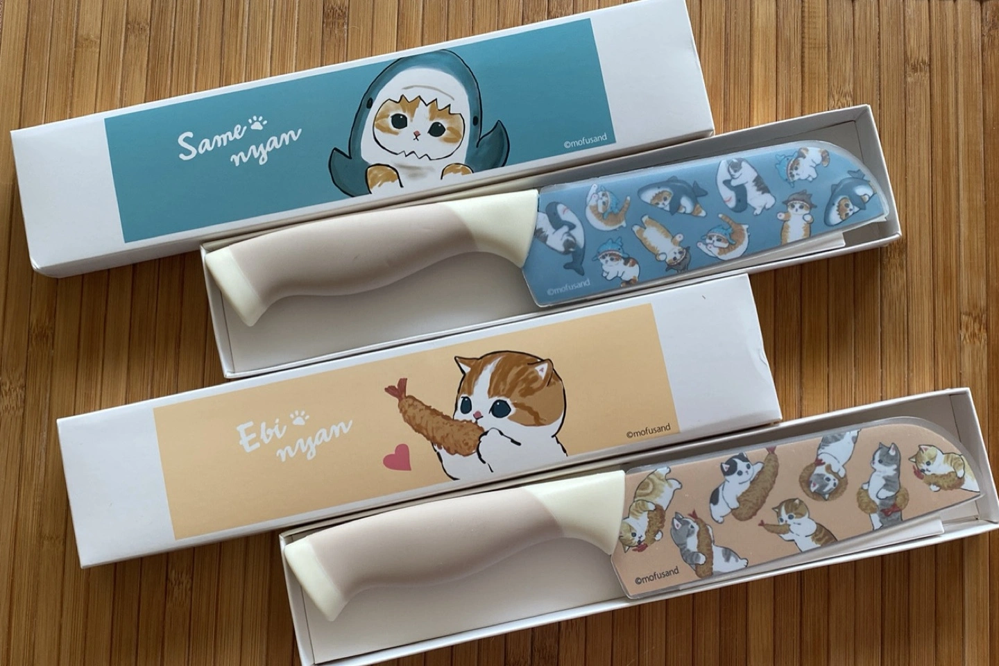 Brand new in box Mofusand theme ceramic knife. One features a cute cat dressed as a shark ('Same nyan') and the other has a cat enjoying a fried tempura ('Ebi nyan')! 14 cm long, stainless steel. Selling for $40 EACH.