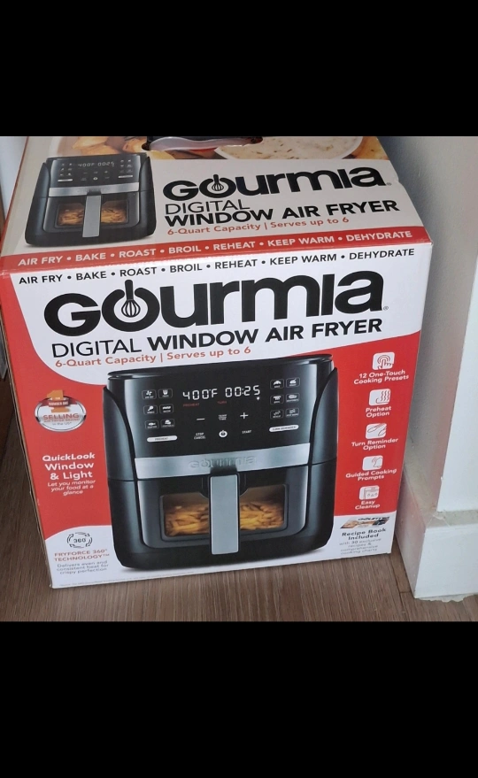 Selling a Gourmia Digital Window Air Fryer with a 6-quart capacity! It serves up to 6 people and has a quick-look window with light so you can monitor your food at a glance. It features FryForce 360 technology for even and consistent heat, and has 12 one-touch cooking presets. It can air fry, bake, roast, broil, reheat, keep warm, and dehydrate! Recipe book included