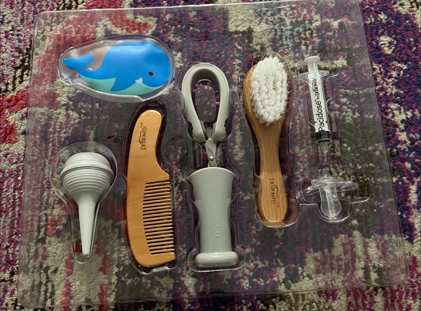 Brand new Dr. Brown's baby care set! Includes a comb, brush, nasal aspirator, medicine dispenser, nail clippers, and a cute whale-shaped bath toy. Perfect for newborns and up!