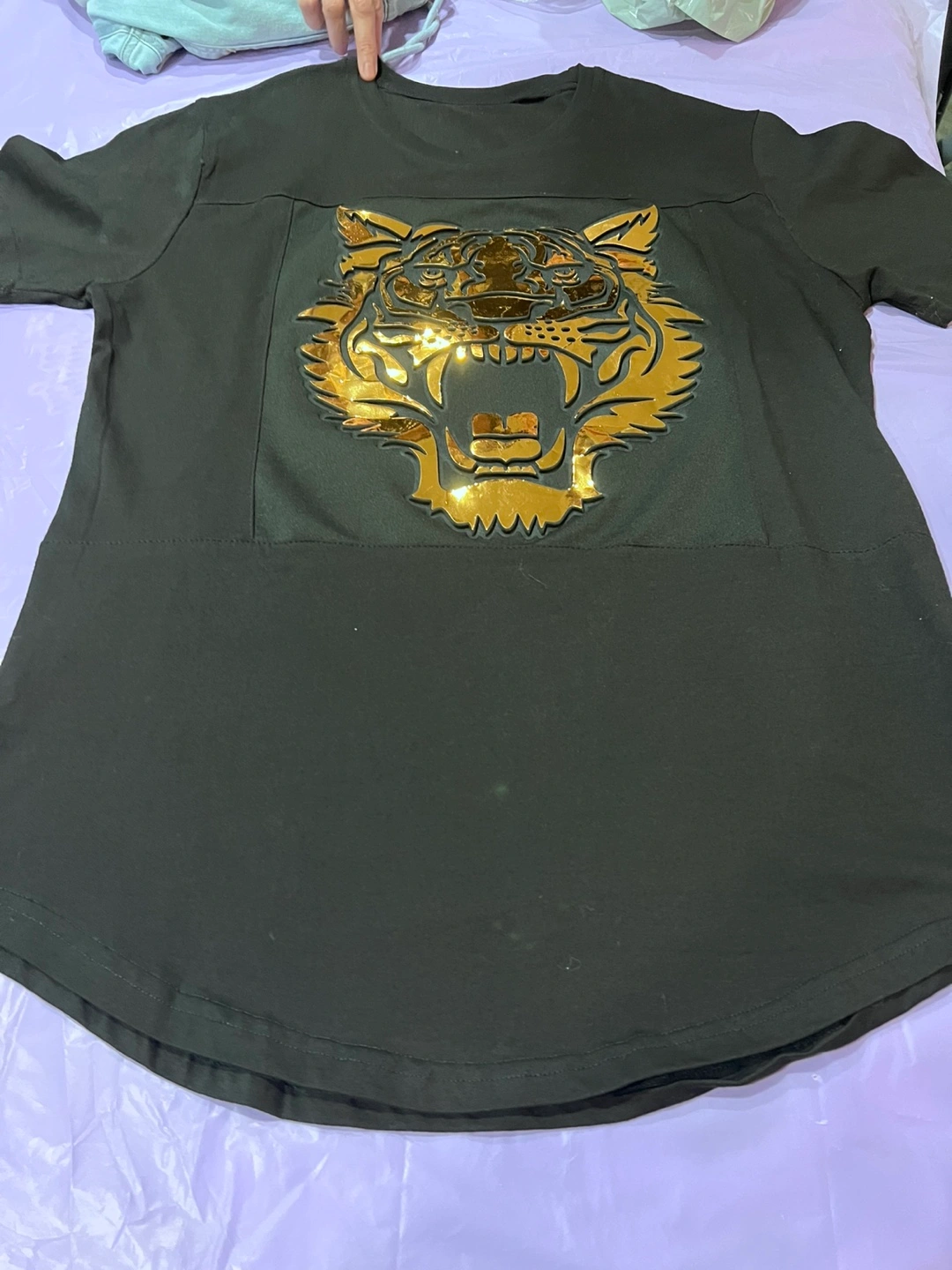 Selling a black t-shirt with a cool tiger design on the front. It's in great condition and ready for a new home!