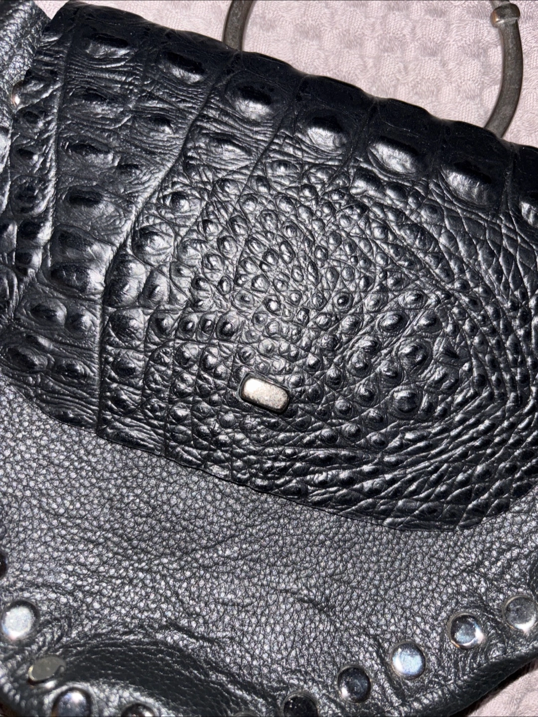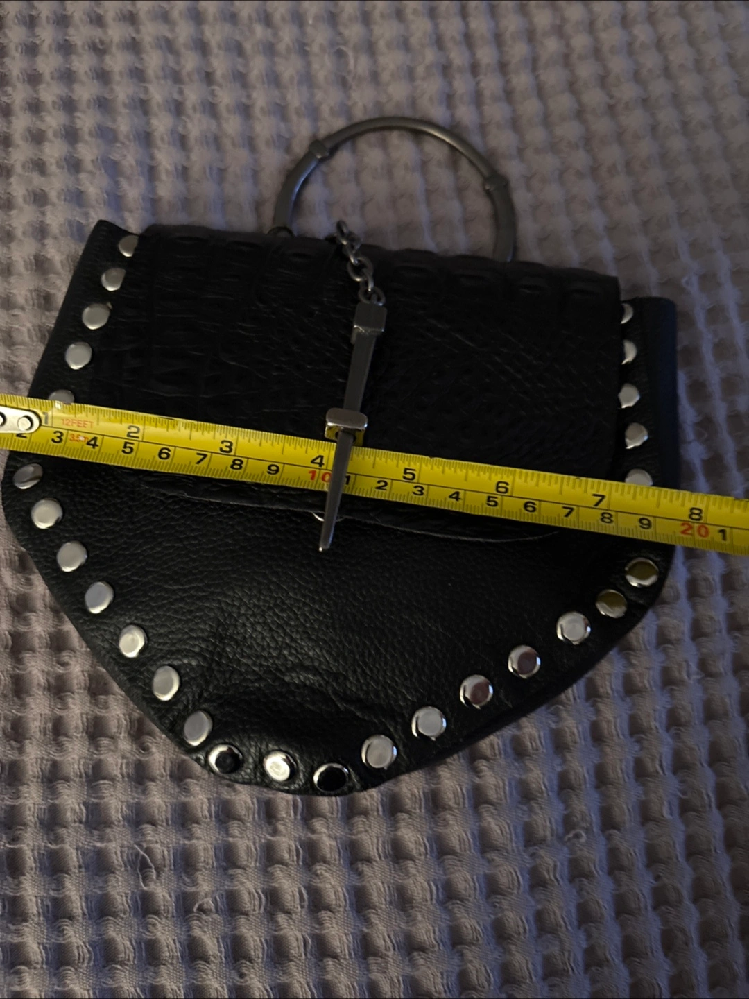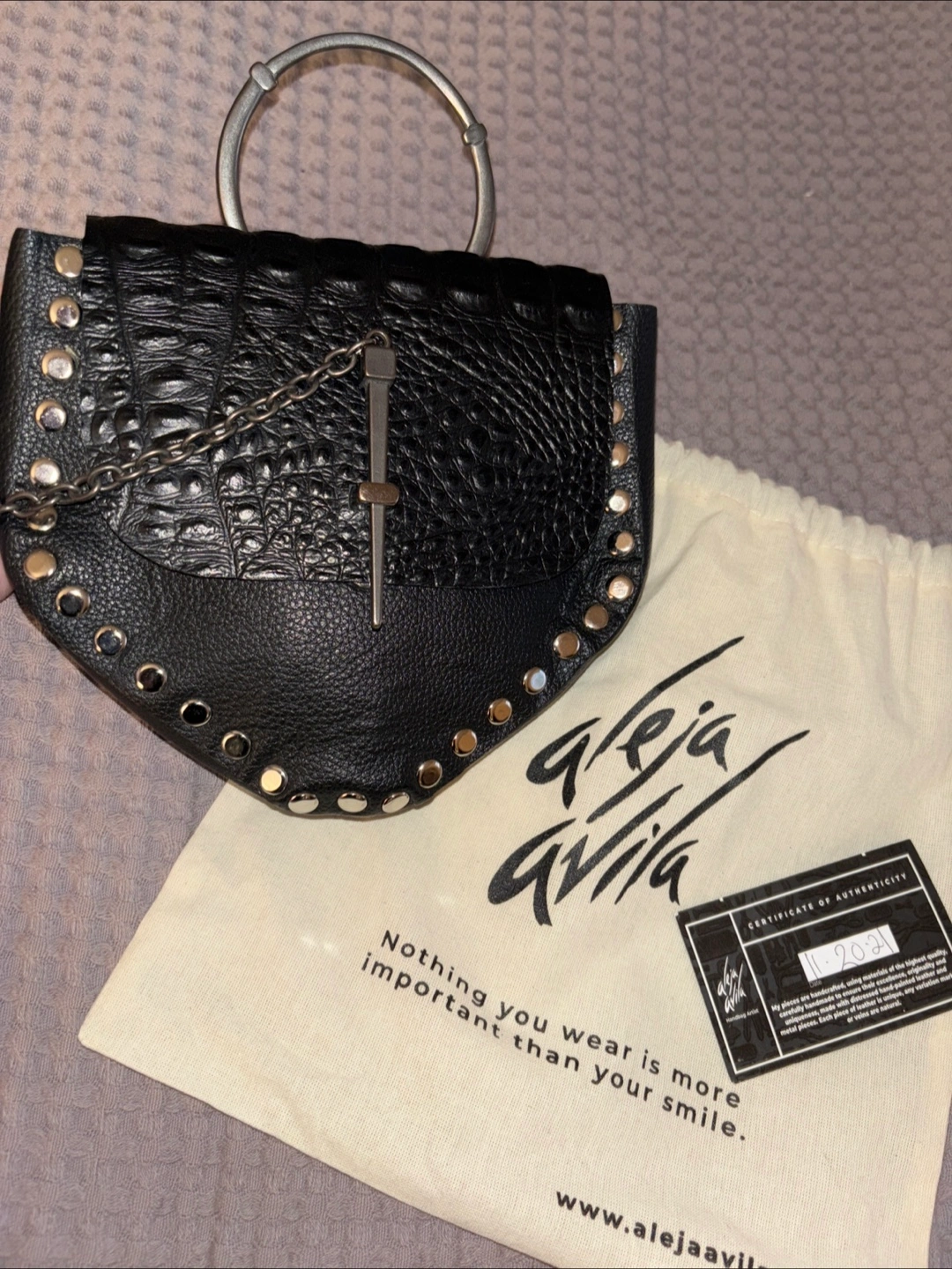 New Aleja Avila handbag in black leather w/dust bag, handmade. It features a unique design with silver stud detailing and a distinctive metal ring handle or over the shoulder or can be worn around the waist, strap is a versatile for different looks and wear. The bag comes with a certificate of authenticity and a dust bag. Perfect for adding a touch of edgy sophistication to any outfit!