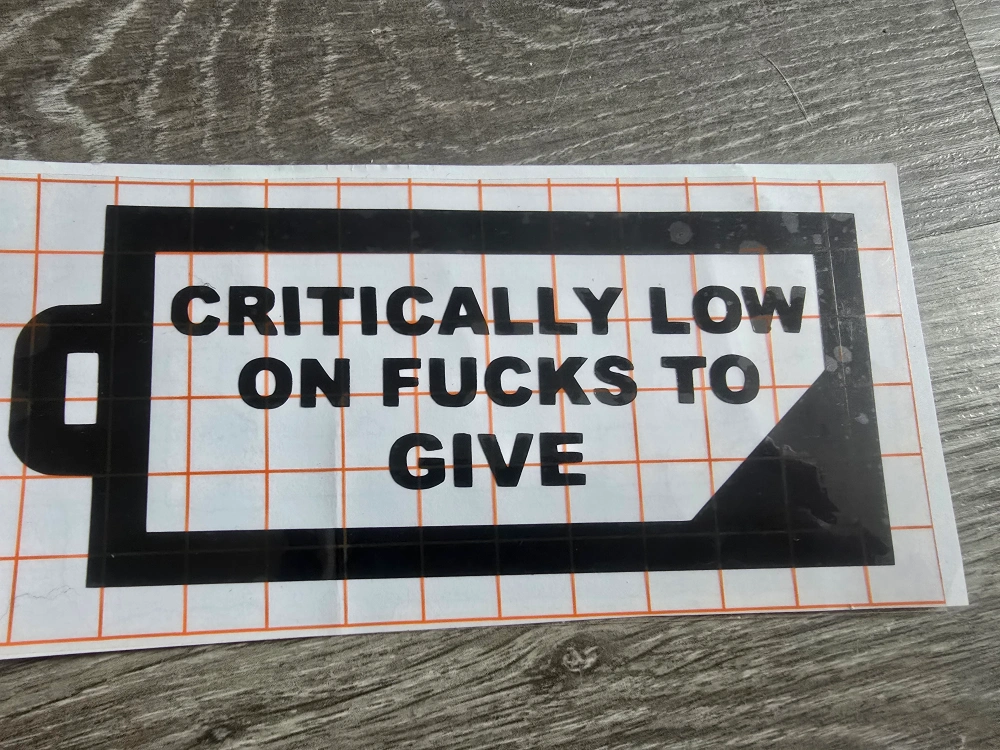 Black, 6 inch wide "Critically Low on Fucks to Give" decal