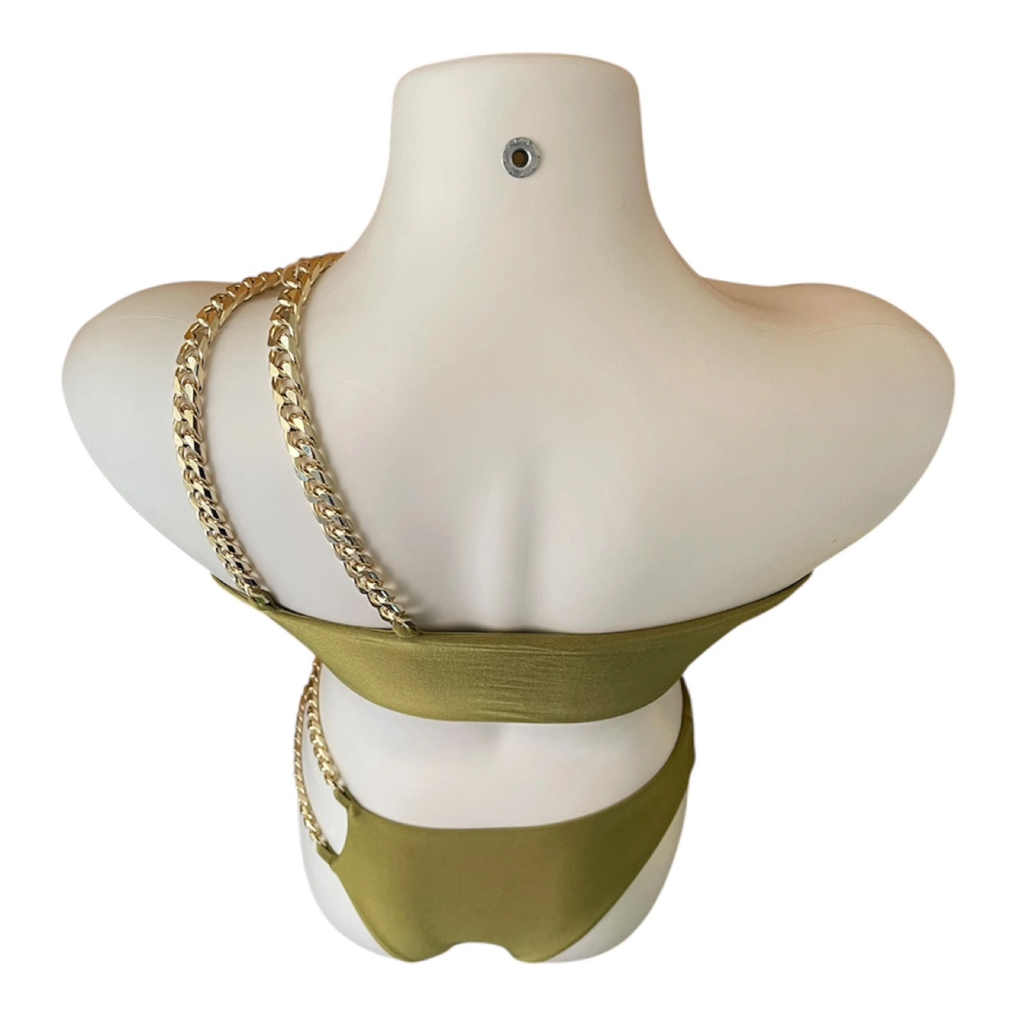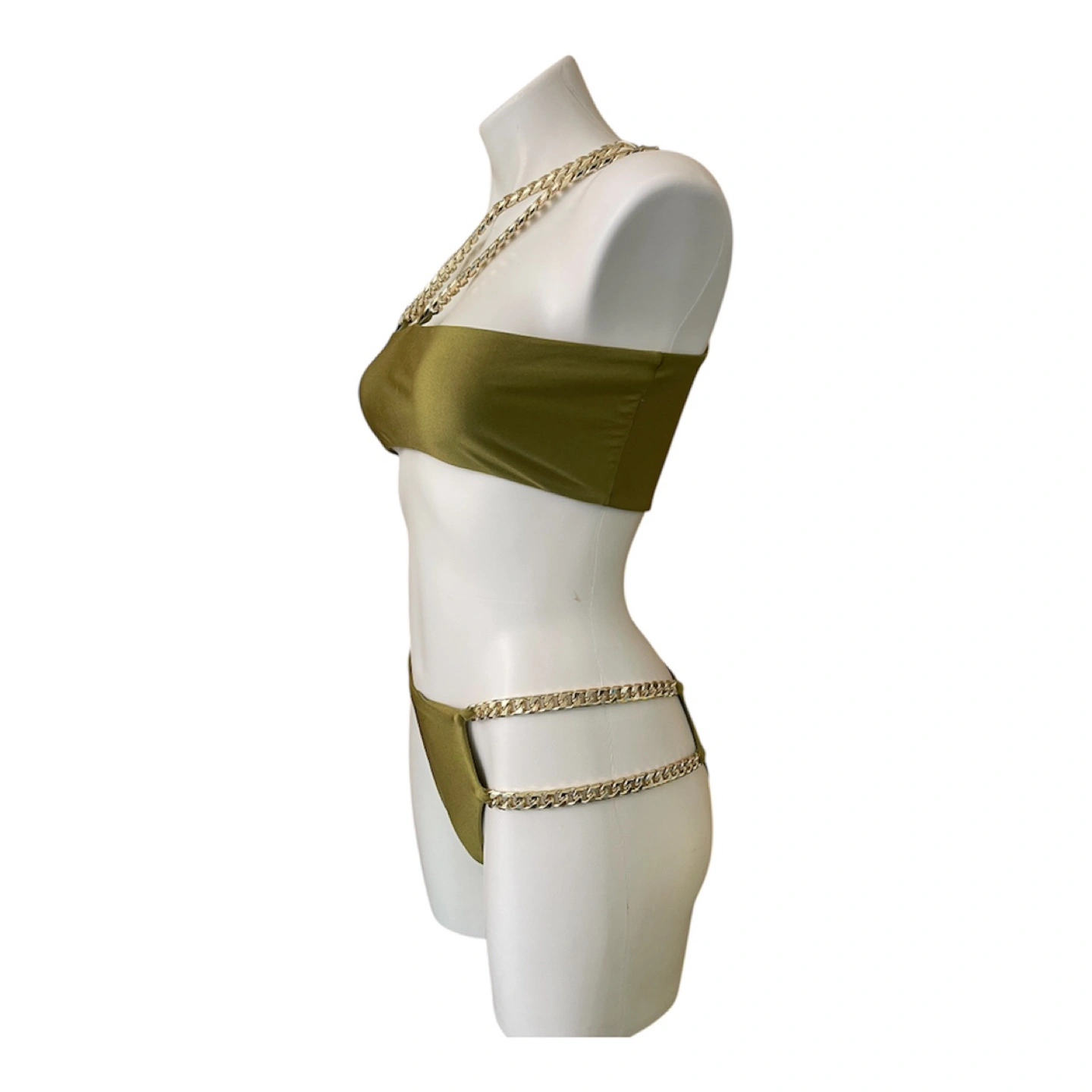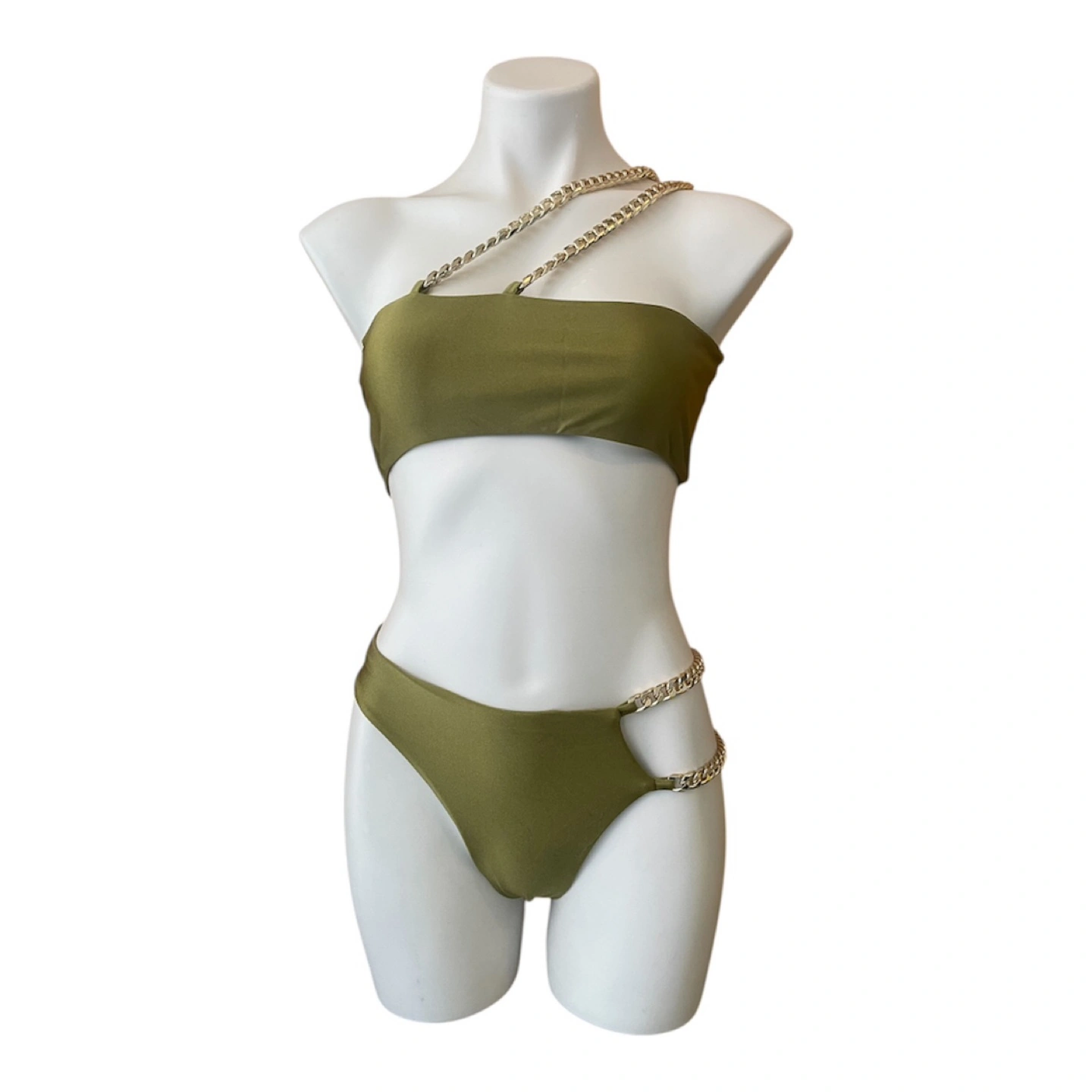 Bandeau Bikini Top with gold chains in green is an edgy spin on the strapless swimsuit top, featuring gold chain accents. This stylish top is made of beautiful shiny olive cashmere lycra for a touch of glam.