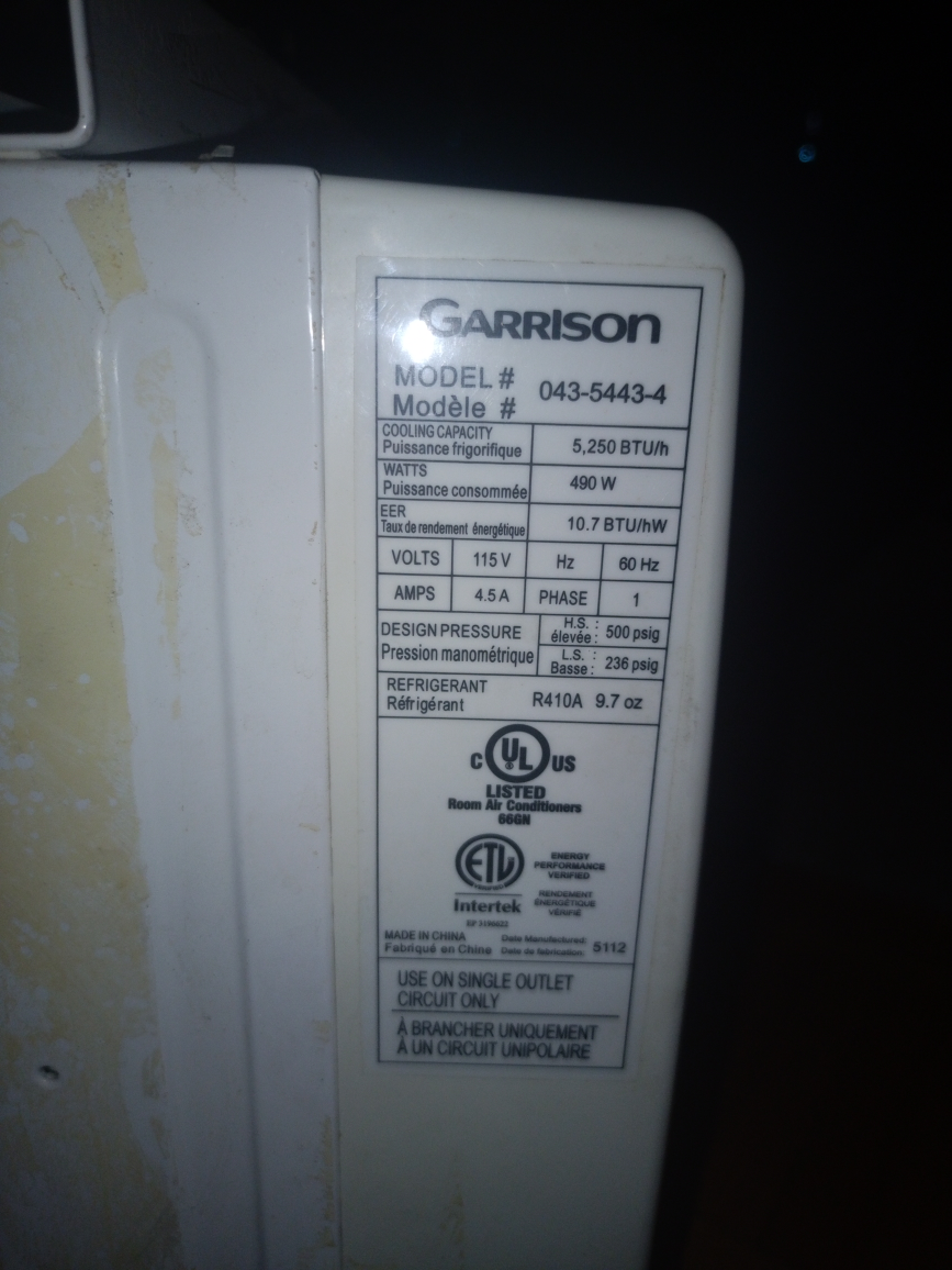 Selling a Garrison window air conditioner. It has a cooling capacity of 5250 BTU/h and uses 490W of power. It runs on 115V and 4.5A with a refrigerant of R410A 9.7 oz. It's in good working condition and ready to keep you cool!