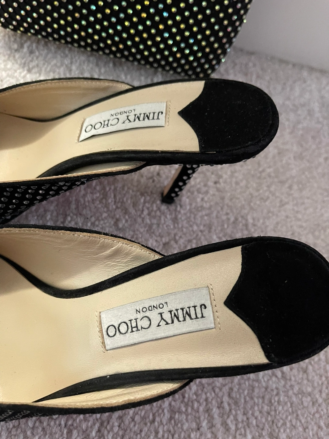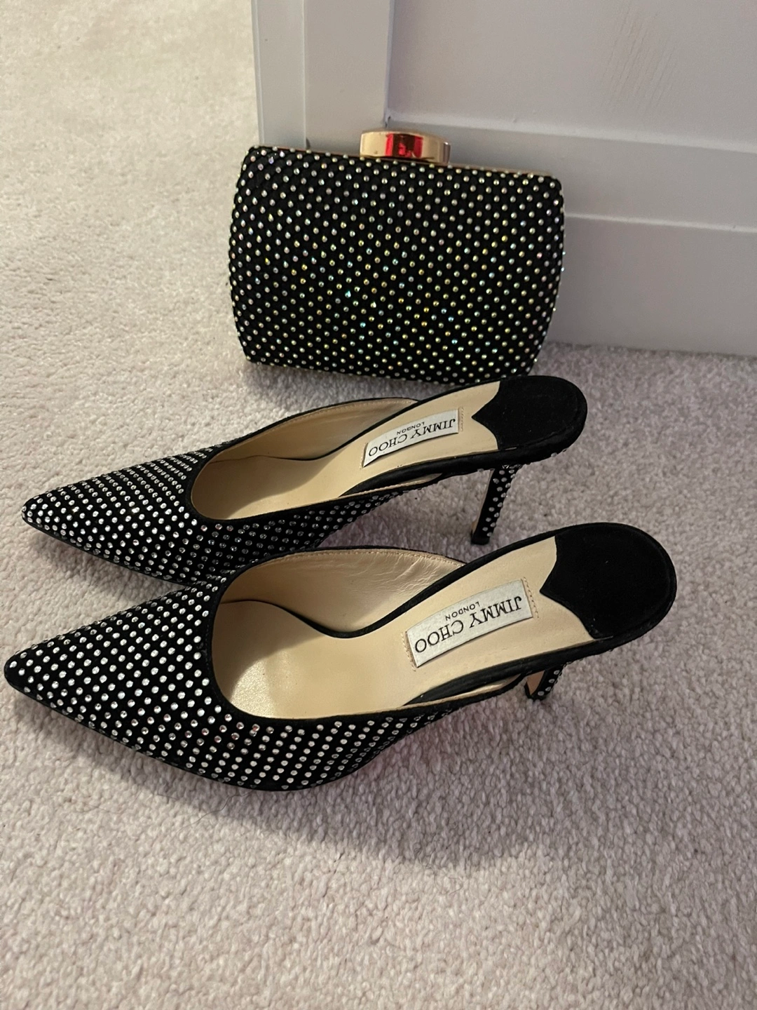 Selling a gorgeous Jimmy Choo clutch and heels set! Both are in excellent condition and feature a stunning, sparkly design. The clutch is perfect for evenings out, and the heels will add a touch of glamour to any outfit. Don't miss out on this stylish combo!