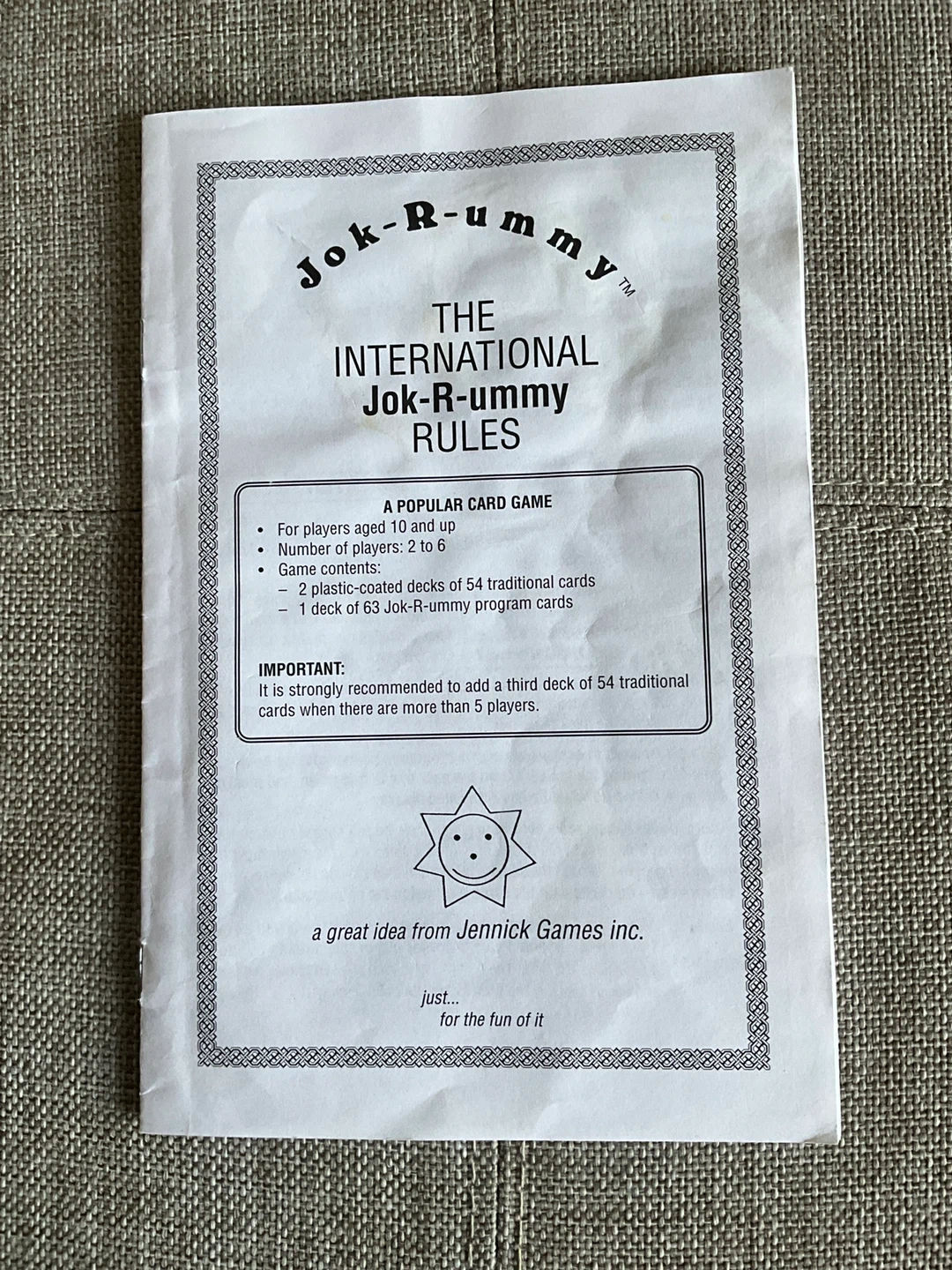 Recommended for ages 10 and up, for 2 to 6 players. Includes 2 plastic-coated decks of 54 traditional cards and 1 deck of 63 Jok-R-Ummy program cards. It's a fun game for the whole family!