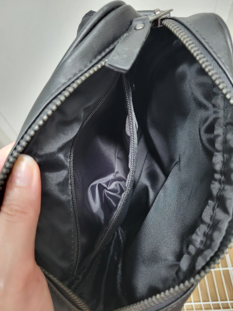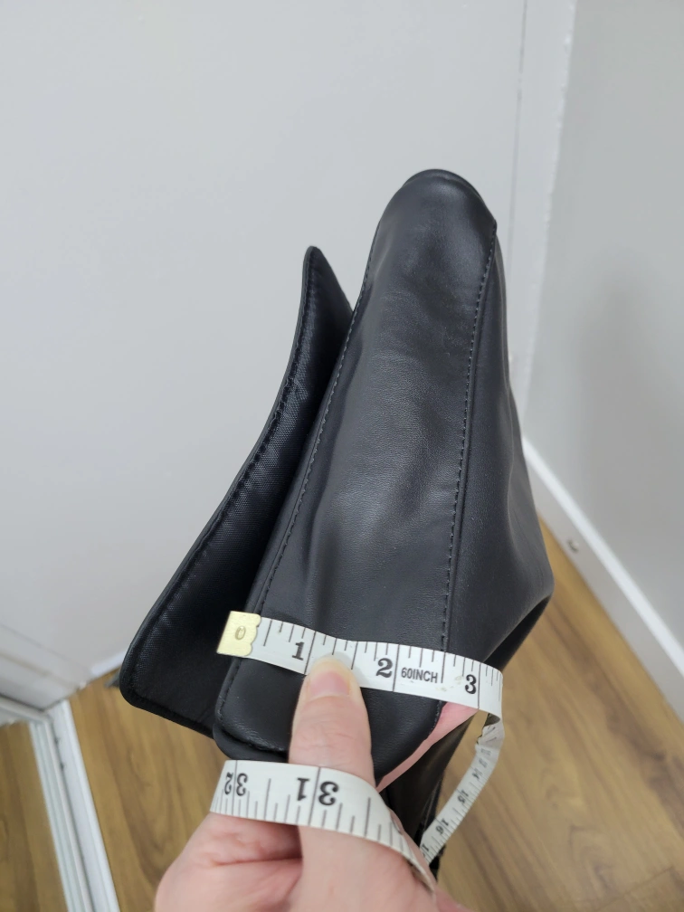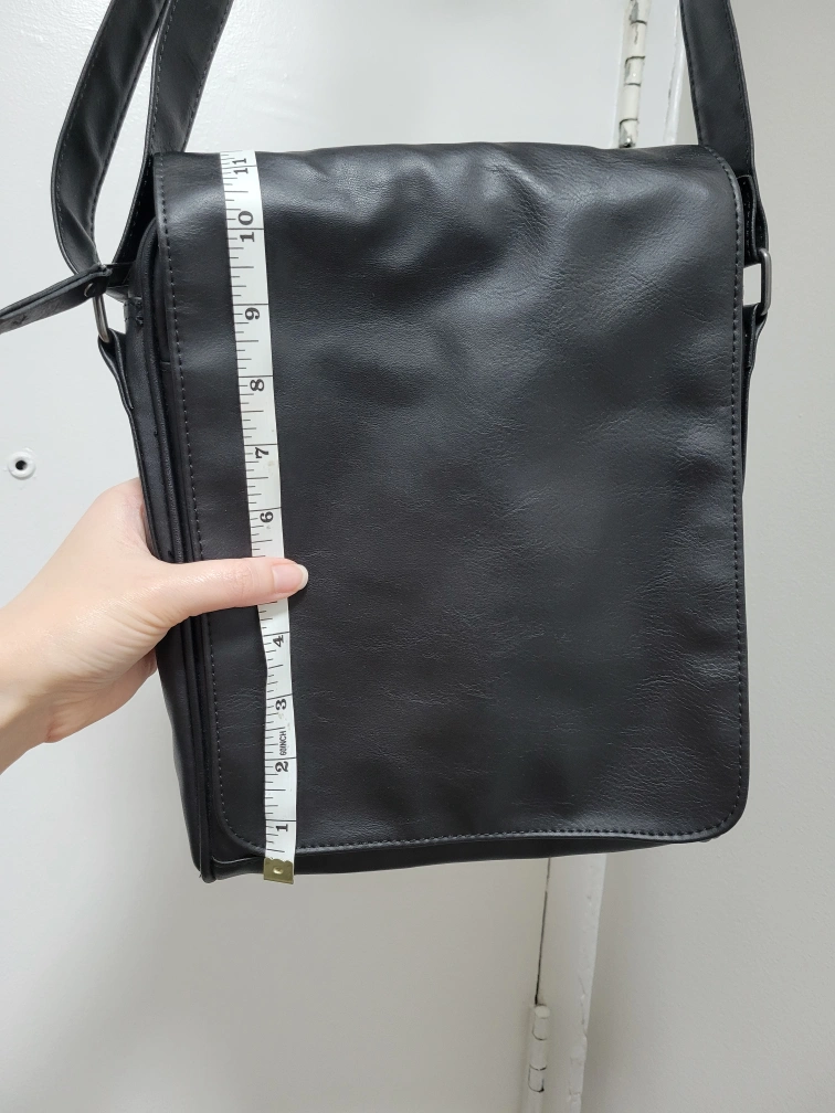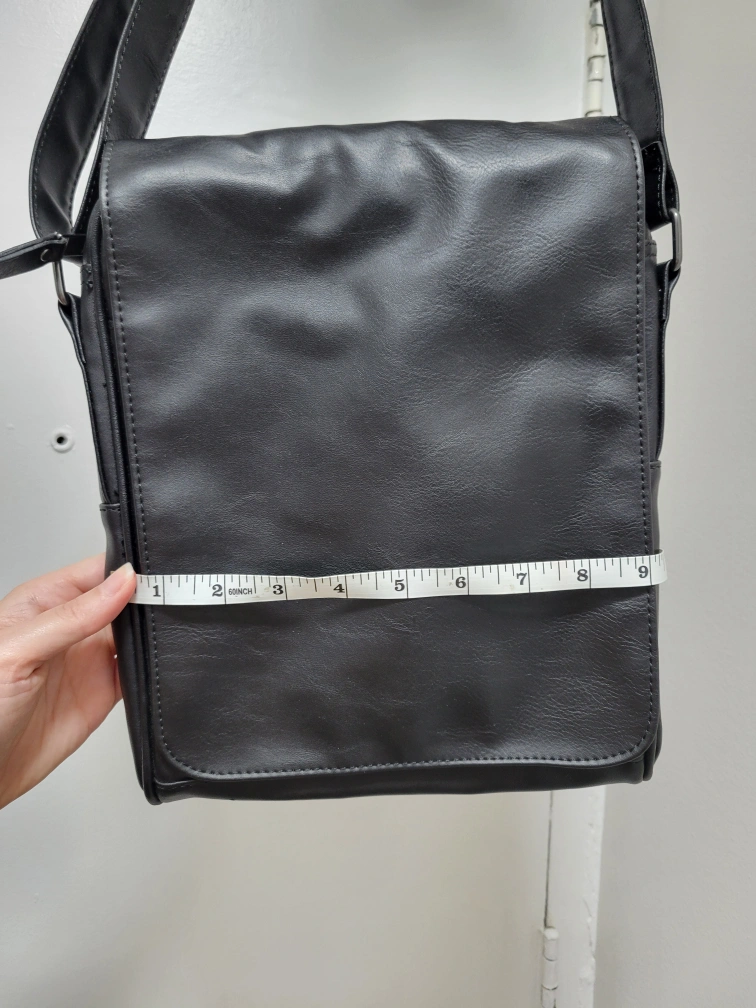 Here's a black messenger bag that's in great shape! It's perfect for carrying your essentials around town or for school. The bag is made of a durable material and features a spacious main compartment and a few smaller pockets for organization. It measures about 10 inches in height and 3 inches in width.