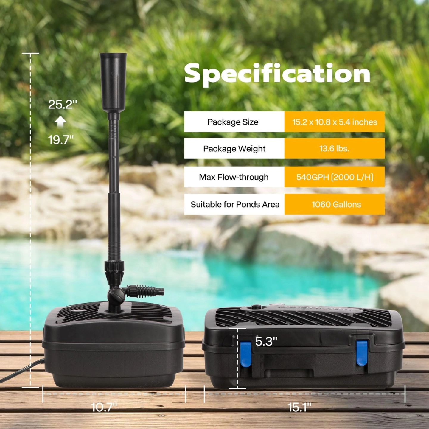 ALL-IN-ONE WATER PUMP POND FILTER - This 540 GPH submersible pond filter pump kit has a maximum flow rate of up to 2000 L/H, making it suitable for ponds up to 1060 gallons; The 33ft long power cord is UL certified for safety and stability, while the IPX8 waterproof rating ensures a long service life; The 4-in-1 multi-functional pond filter fountain pump includes a fountain, pump, filtration, and lamp, making it a versatile choice for outdoor ponds