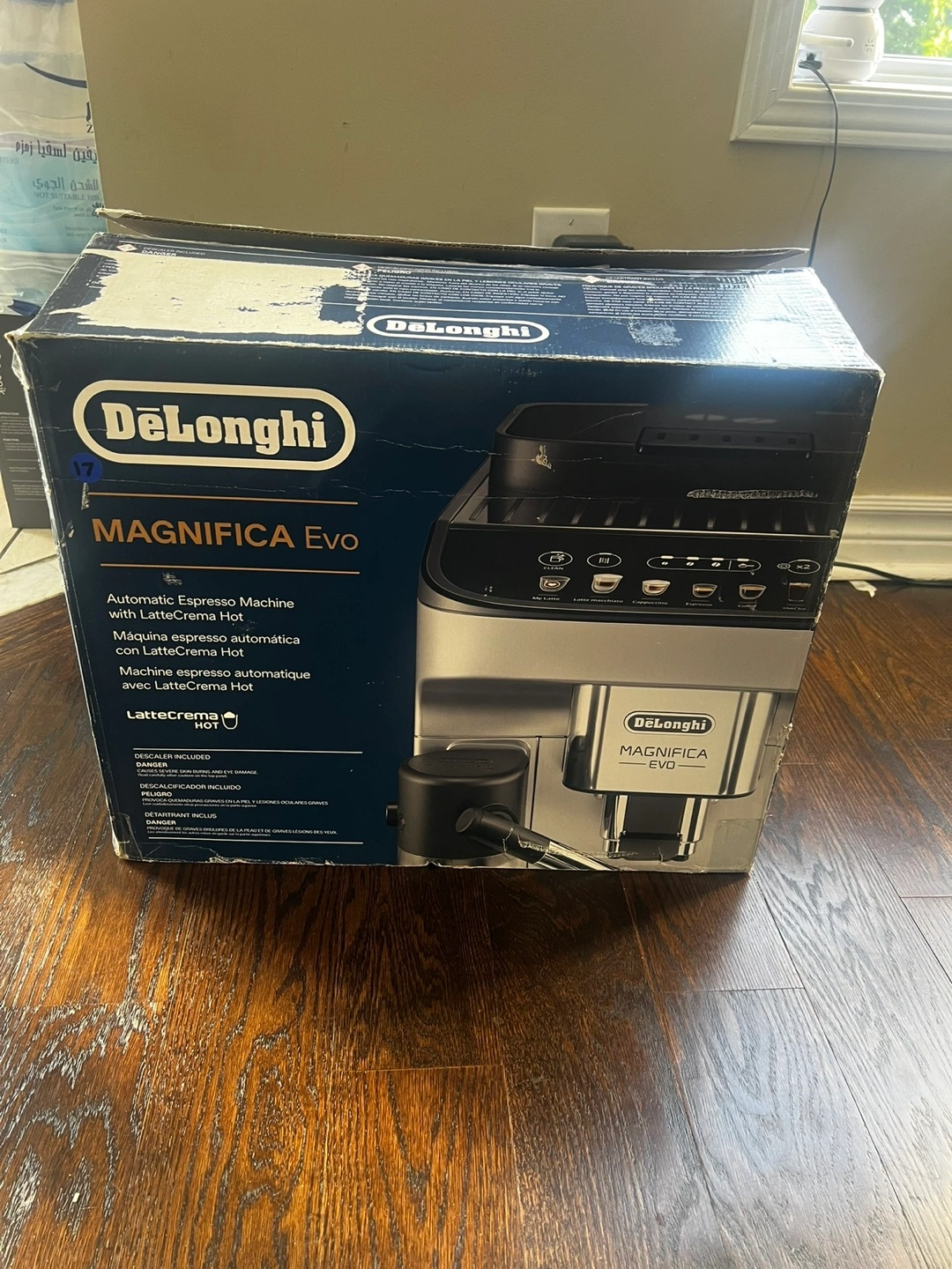 15Selling a DeLonghi Magnifica Evo automatic coffee machine. It has a built-in conical burr grinder with 13 settings for freshly ground coffee. The machine features one-touch recipes with colour icons, including Espresso, Cappuccino, Latte Macchiato, Iced Coffee, and Hot Water. The box is included!