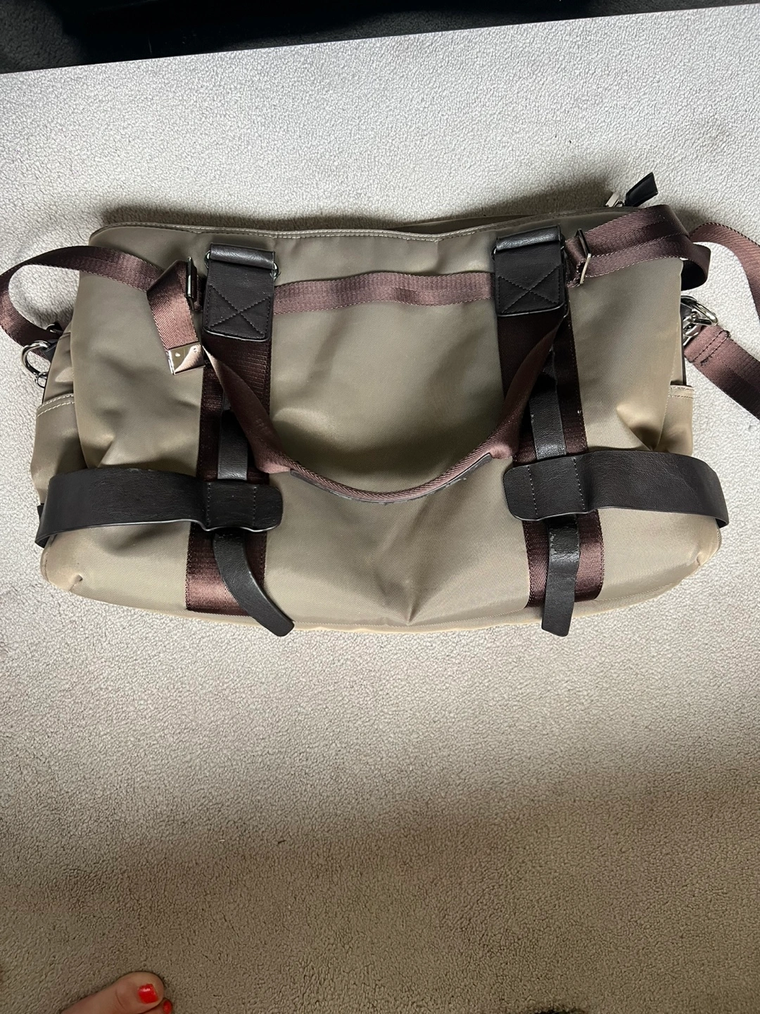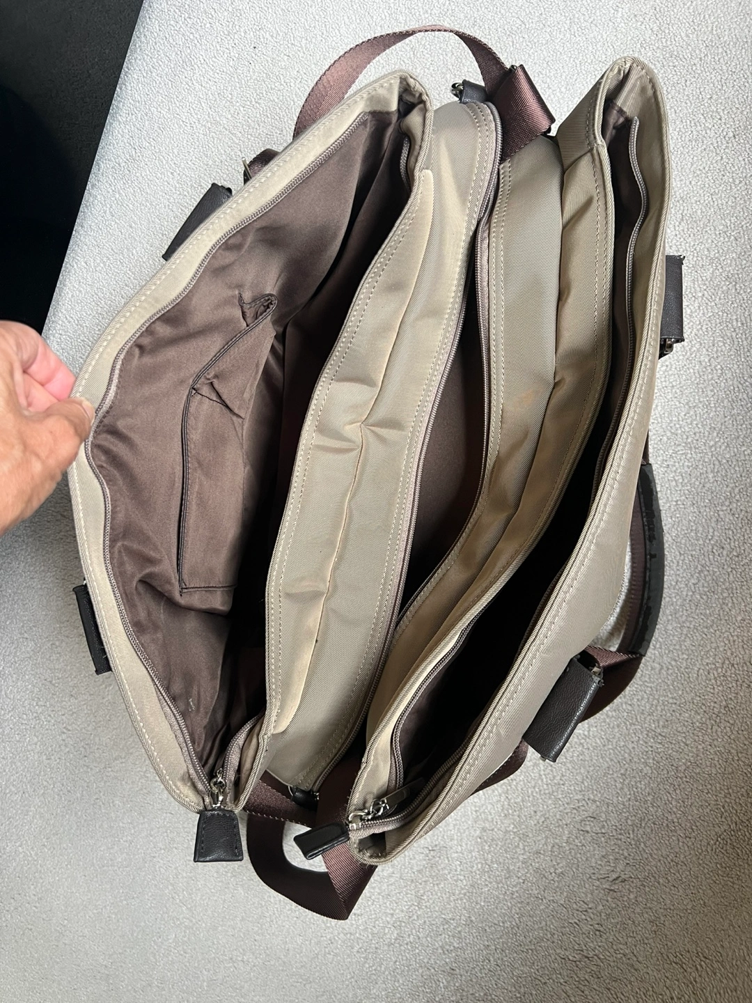 65Selling a tote bag in a neutral beige and brown colour scheme. It has multiple compartments inside, making it great for organization. It's in good condition and ready for a new home. Used twice.