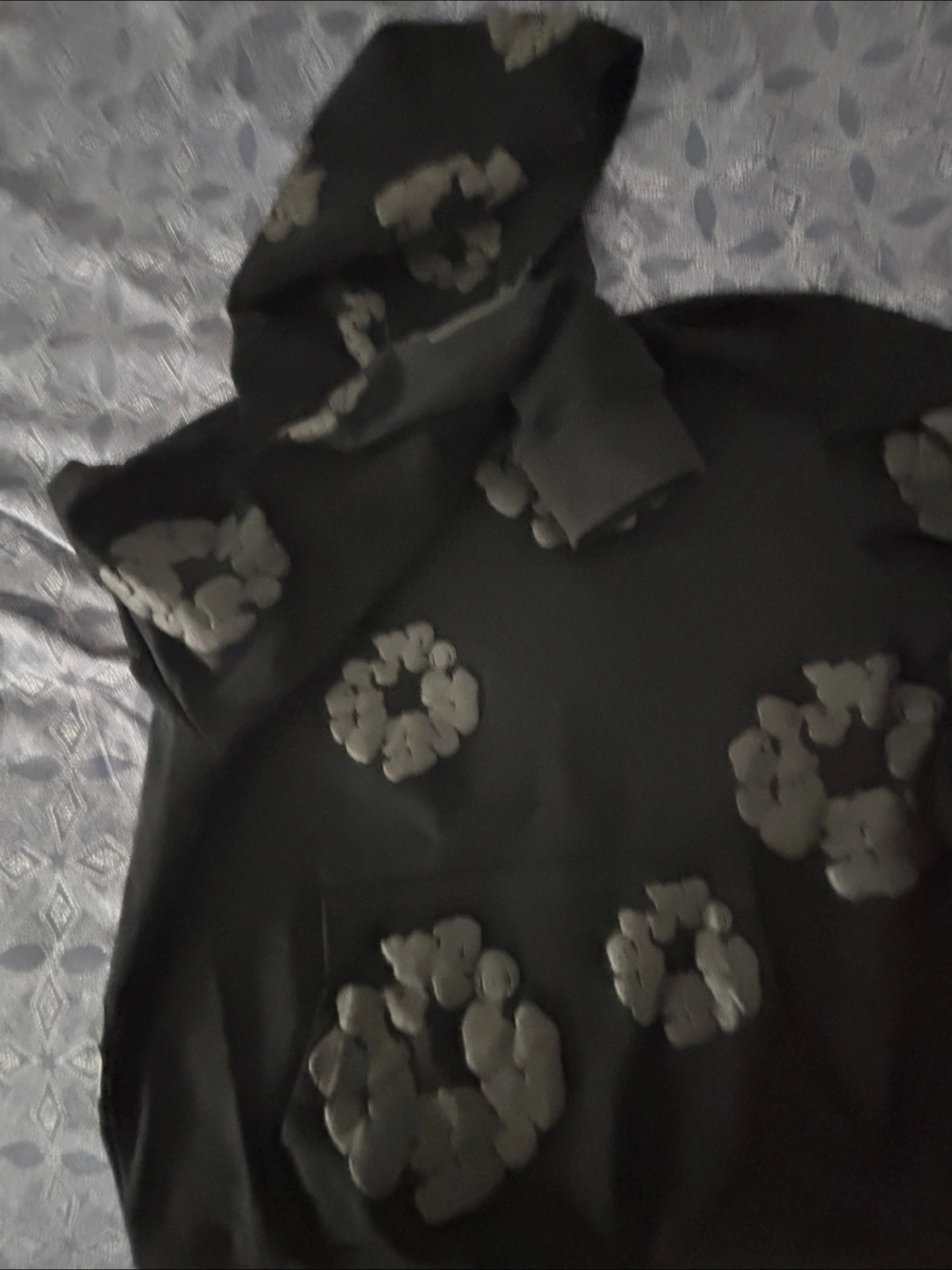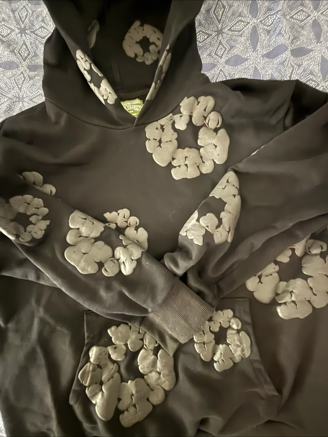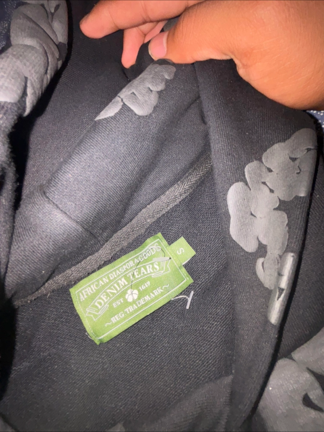 Selling a Denim Tears hoodie in size small. The hoodie is black with a unique floral design. The tag indicates it's made in the USA. Please note the care instructions: hand wash, no bleach, cool iron, do not dry clean, and no tumble dry