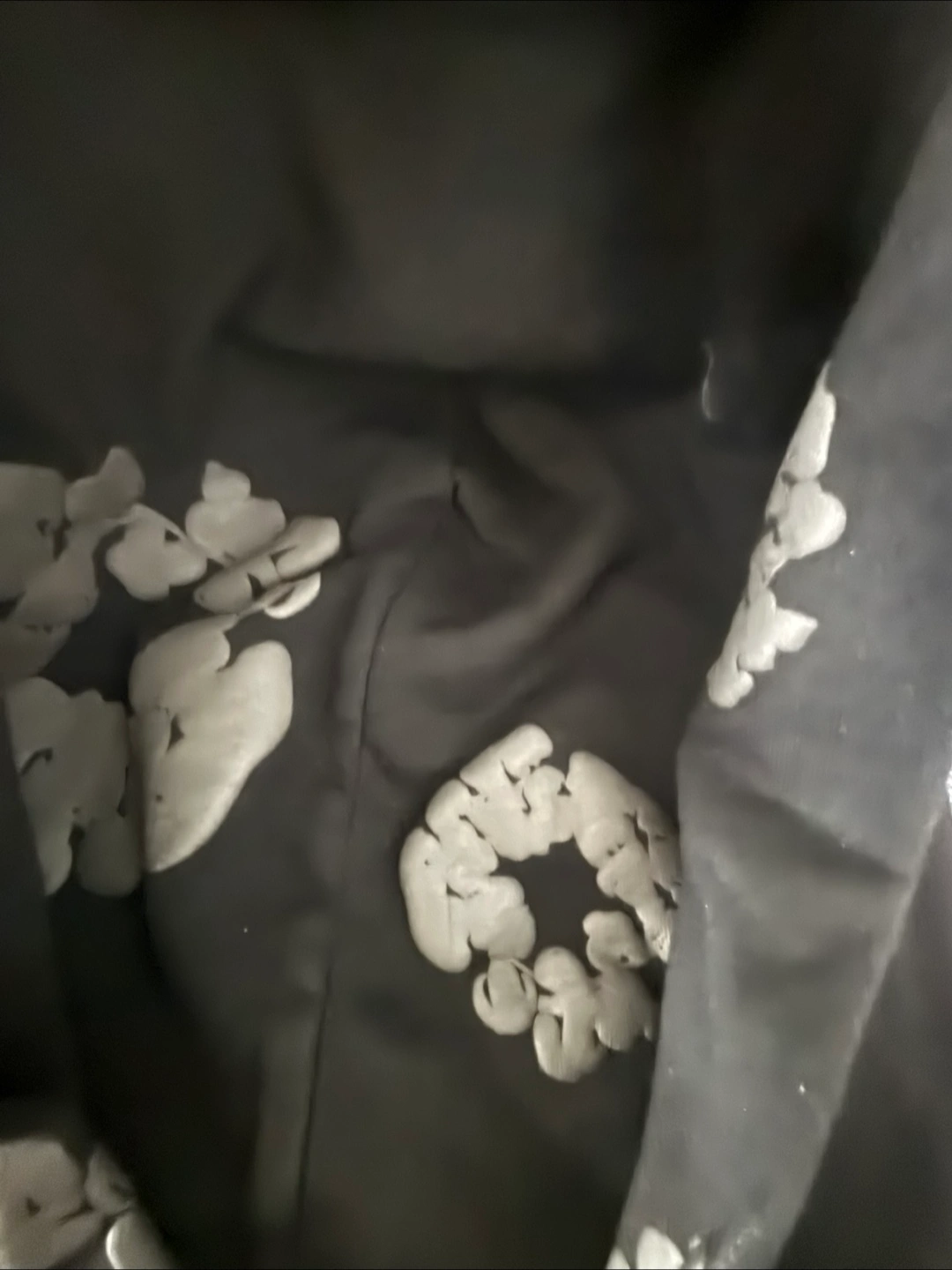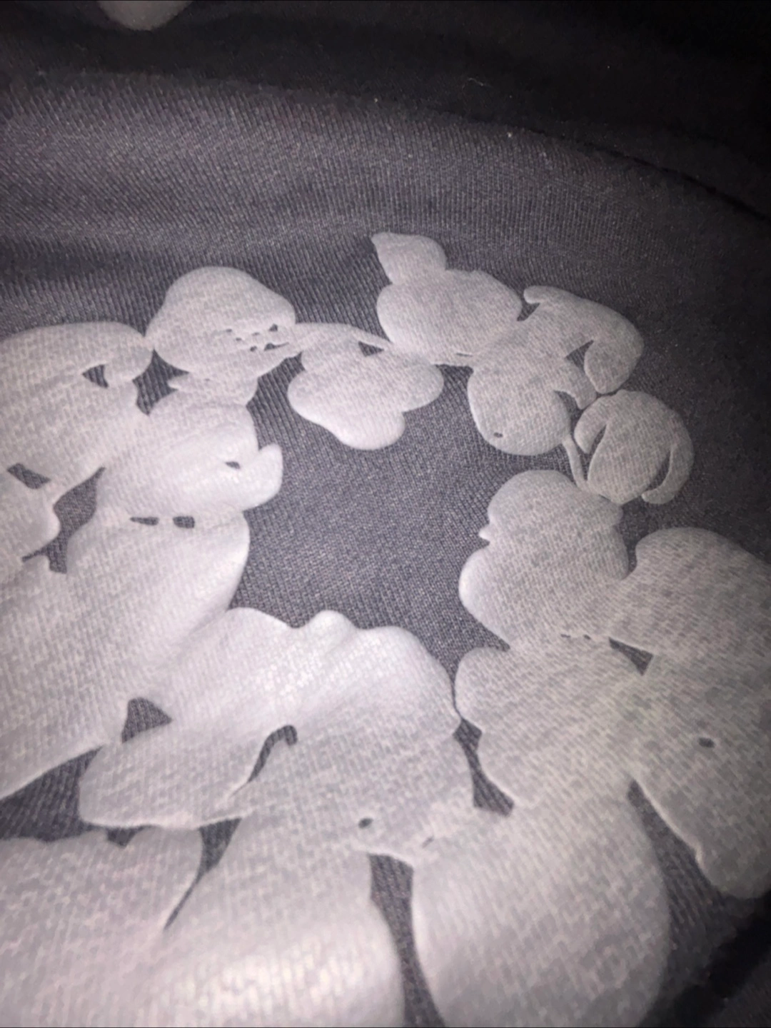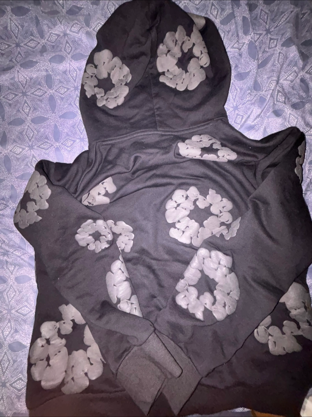 Selling a Denim Tears hoodie in size small. The hoodie is black with a unique floral design. The tag indicates it's made in the USA. Please note the care instructions: hand wash, no bleach, cool iron, do not dry clean, and no tumble dry