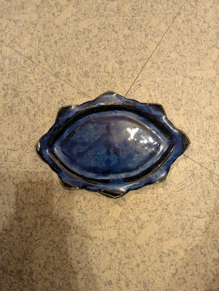 Selling a lovely blue ceramic decorative tray. It's in great condition and would look great on a coffee table or shelf. The tray has a unique shape and a beautiful glazed finish, perfect for adding a touch of elegance to your home decor