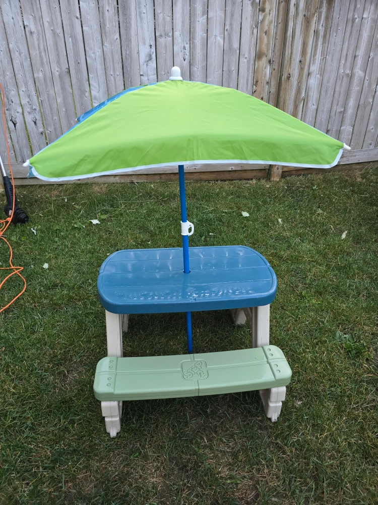 This Step2 picnic table is perfect for kids to enjoy outdoor meals or activities! It comes with a cute umbrella to provide shade on sunny days. The table is in great condition and ready for a new home. It's the perfect size for little ones to sit and play or have a snack outside