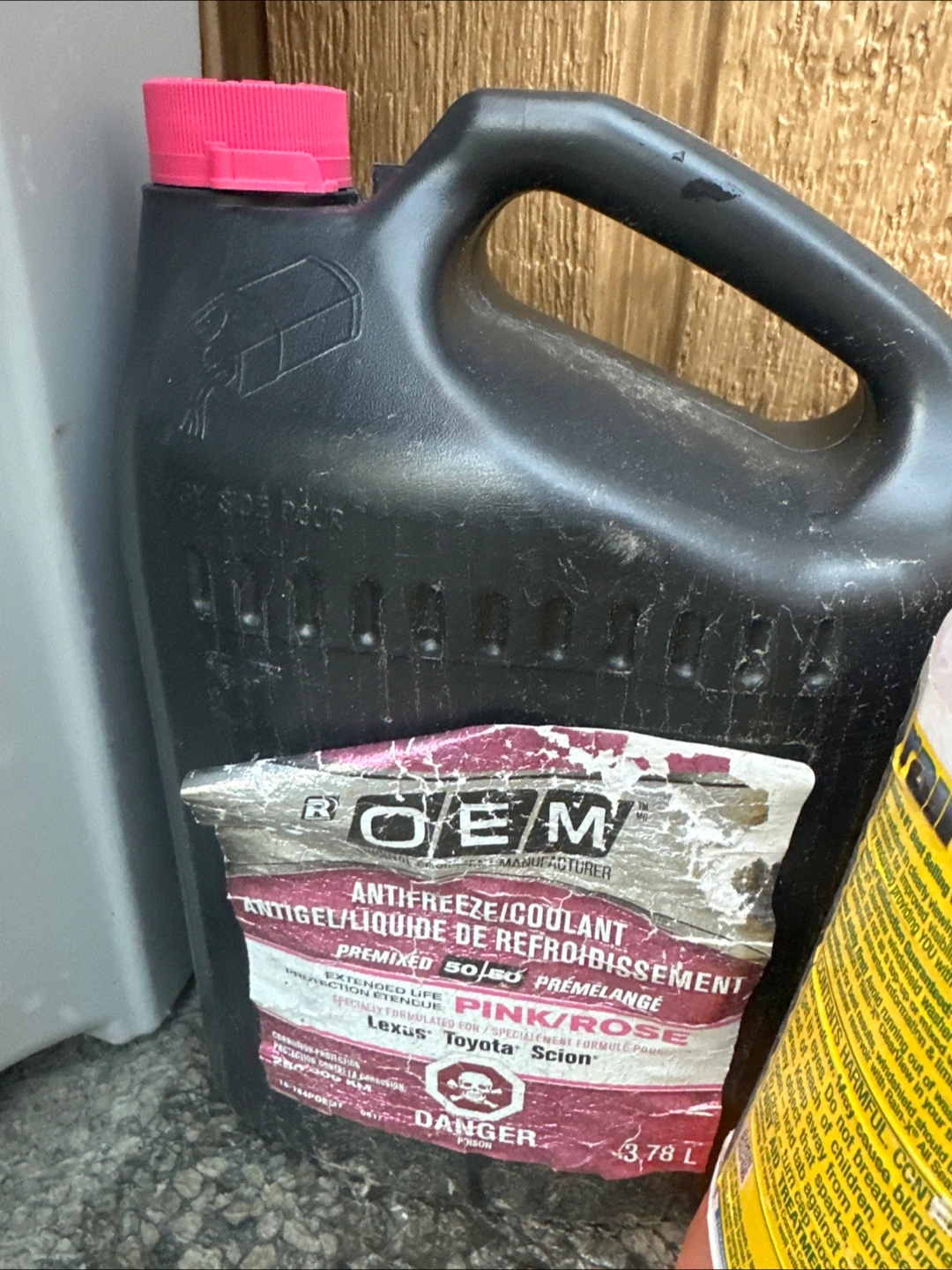 Selling a jug of OEM antifreeze/coolant. It's premixed 50/50 and specially formulated for Lexus, Toyota, and Scion vehicles. It's pink in colour and comes in a 3.78 L container.