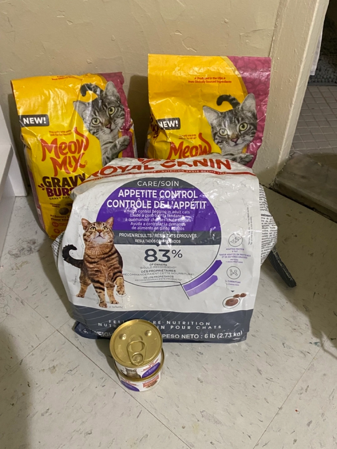 Selling a mix of cat food including Royal Canin Appetite Control(1/4 bag, 2 can wet food) and Meow Mix(2bags). Perfect for keeping your feline friend happy and healthy! Had to get rid of cat due to allergy.