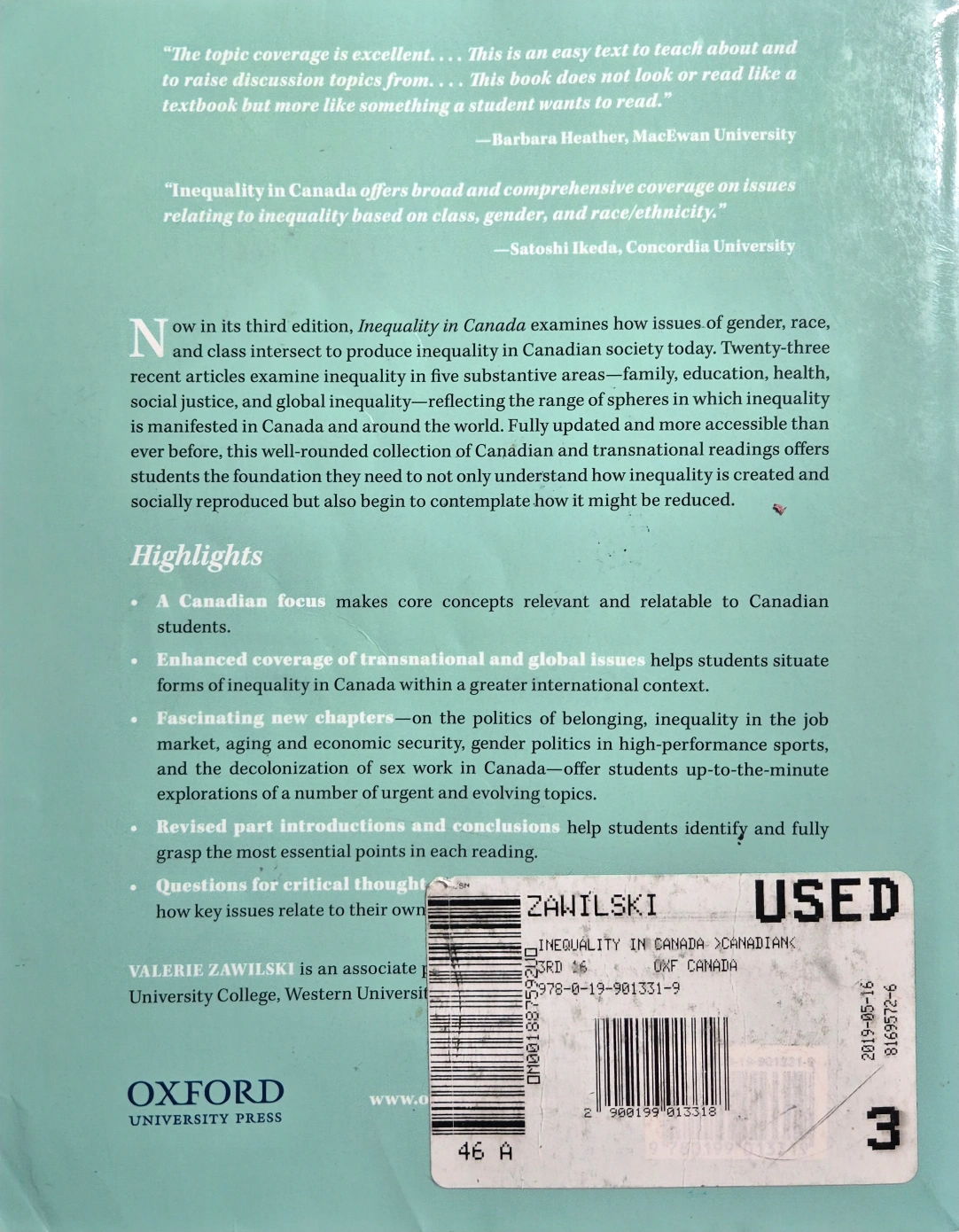49Selling "Inequality in Canada: A Reader on the Intersections of Gender, Race, and Class", Third Edition, edited by Valerie Zawilski. This book examines inequality in Canadian society, covering areas like family, education, health, social justice, and global inequality. It includes a Canadian focus to make core concepts relevant to students, enhanced coverage of transnational and global issues, and new chapters on various topics like aging and economic security and gender politics