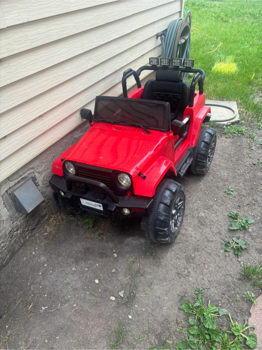 Selling a fun red ride-on Jeep for kids! It's in good condition and ready for a new adventurer. Perfect for outdoor play and exploring the backyard. Let your little one cruise in style! Still works just need to charge the battery. An also add a battery for more speed. Plays music through the radio. Lights and horn work