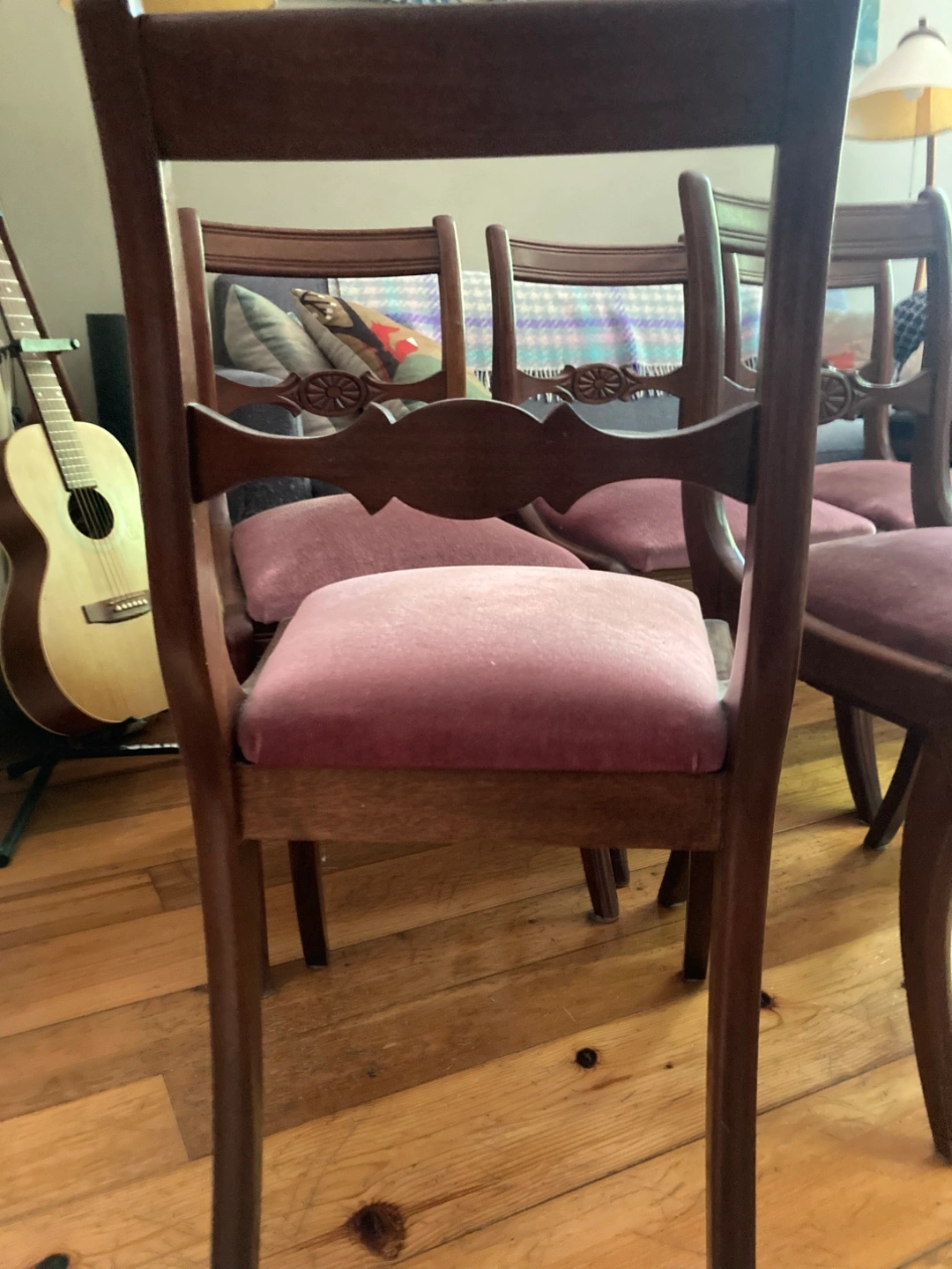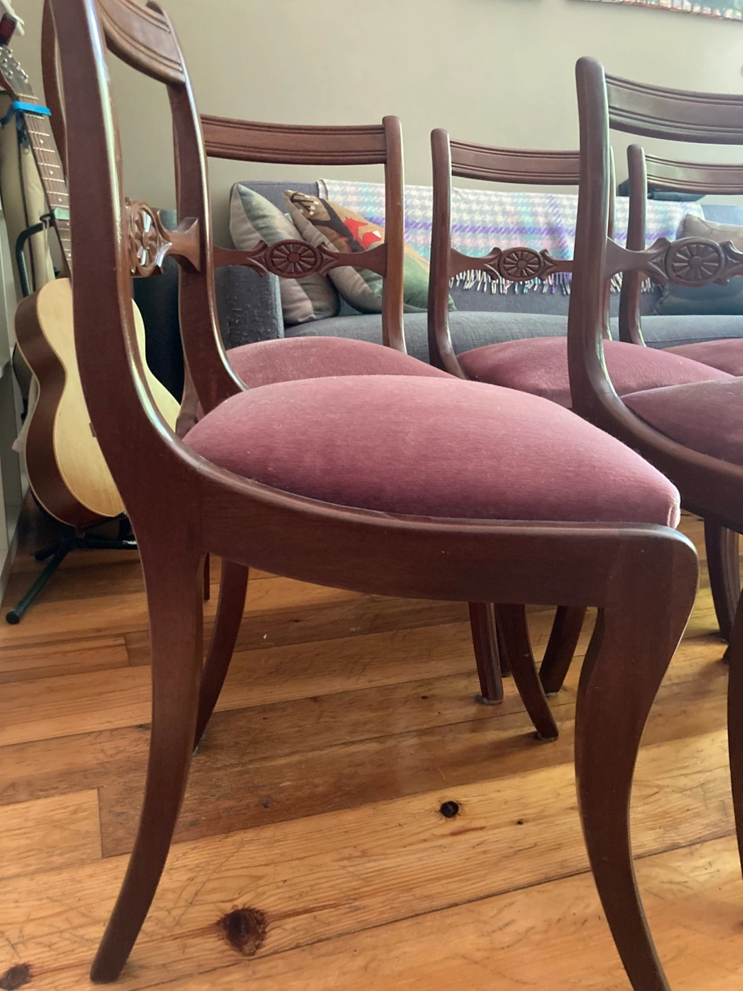 6 beautiful solid wood chairs with velvet seats. mostly in good repair and very solid. cat scratch damage on the back corner of one seat. aside from that the chairs are in good conditions. the joints are all solid and tight.