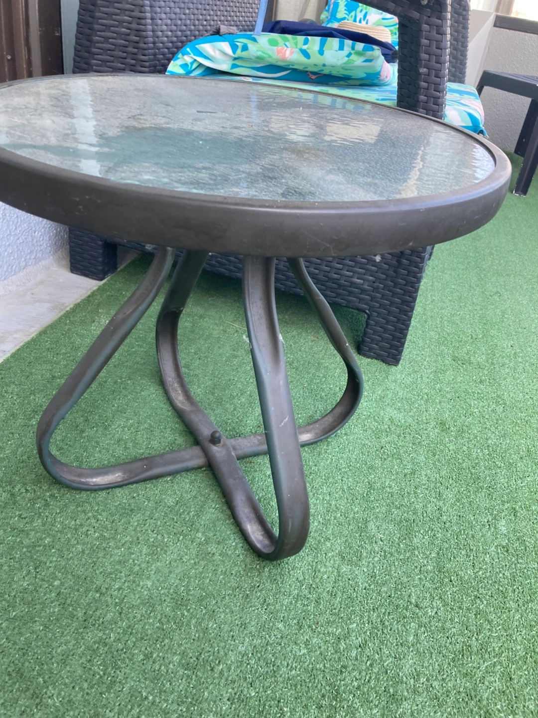 Selling a glass top patio side table. It's perfect for your outdoor space. The table has a round glass top and a metal frame. It's in good used condition. Big enough for your coffee book snack.