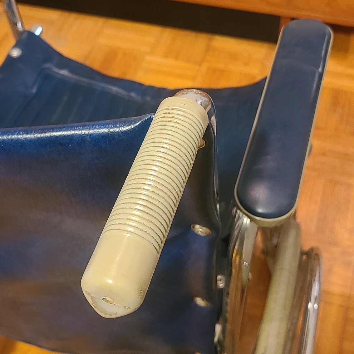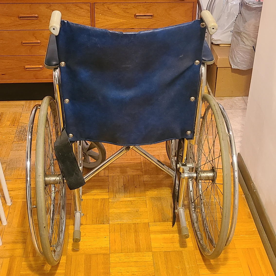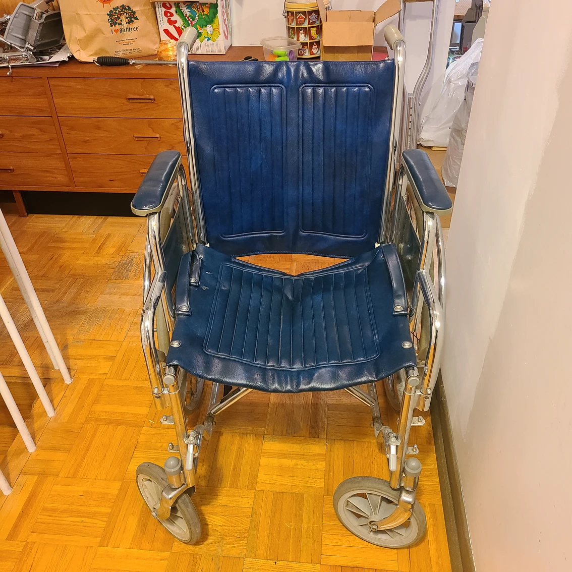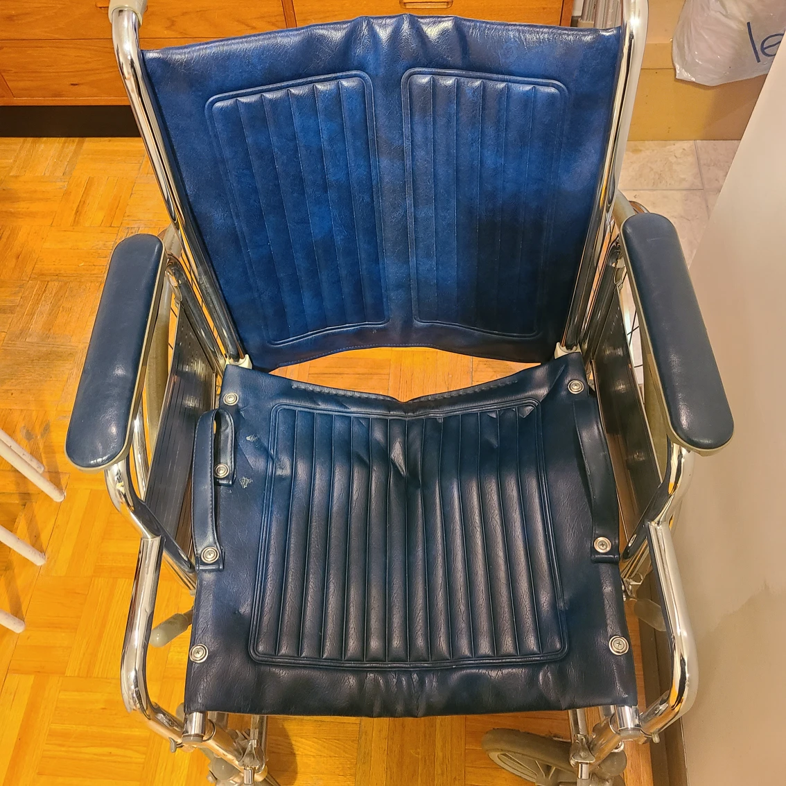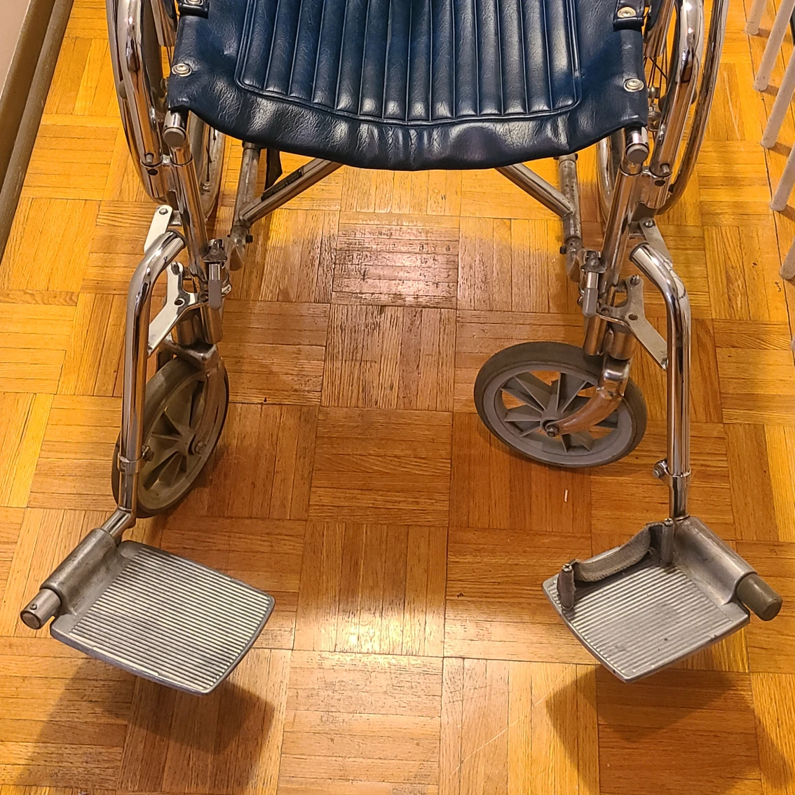 Good used condition. Blue leather upholstery, metal tubing. Includes detachable foot rests. 20" wide, 37" tall, 32" from back wheel to front wheel. Open to reasonable offers! Feel free to make an offer. Pick up at Spadina Ave/Cecil St