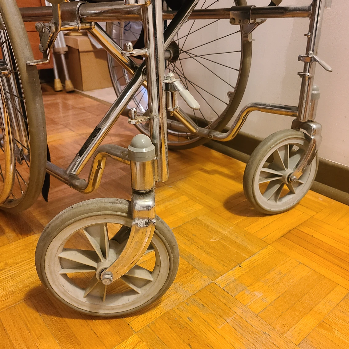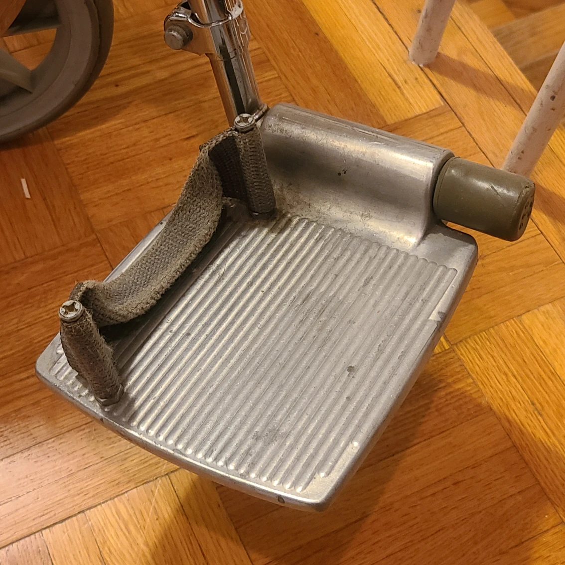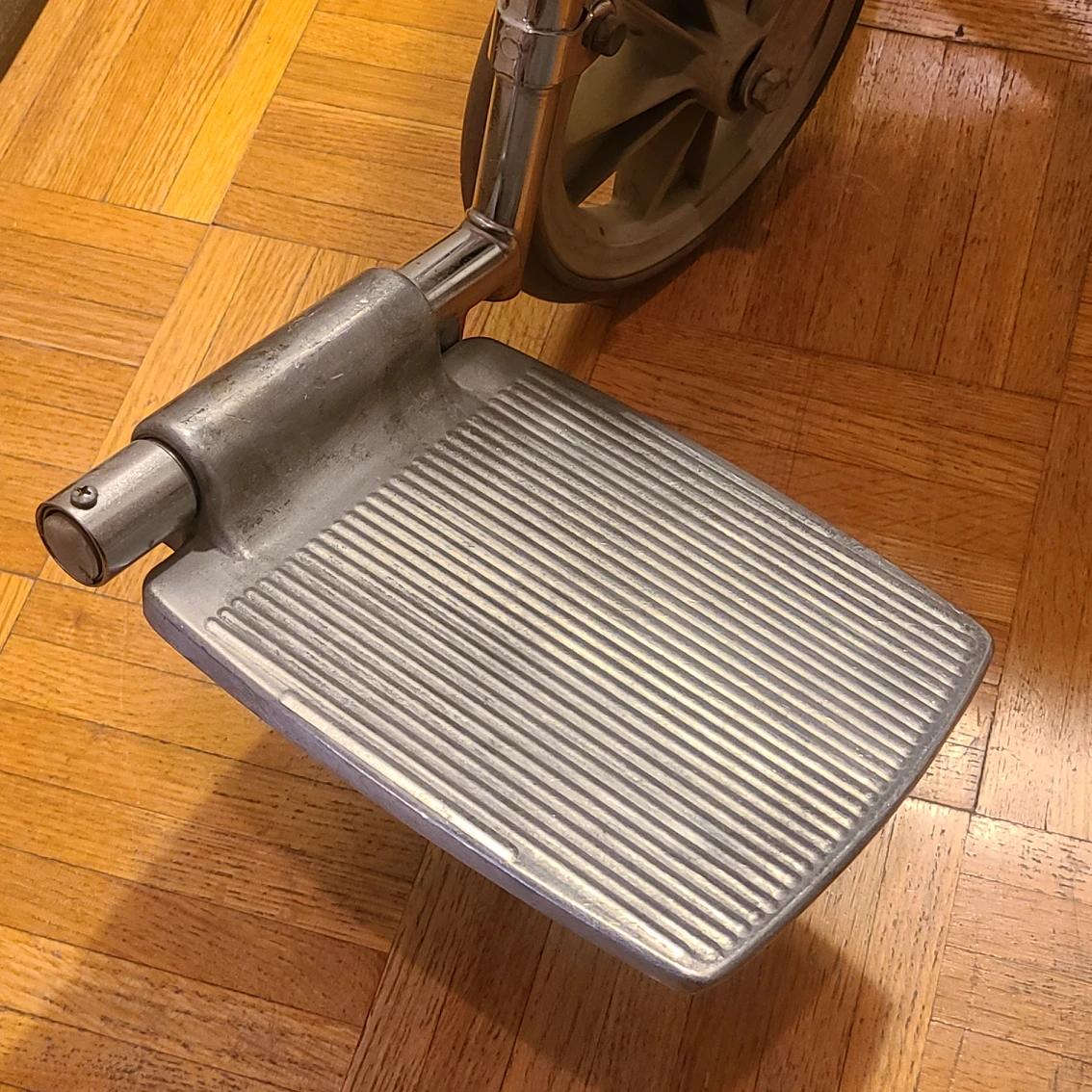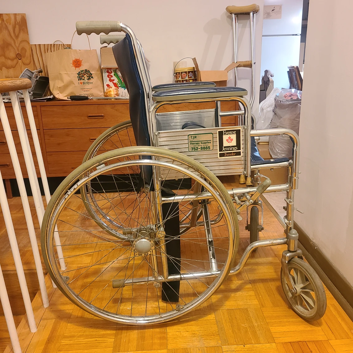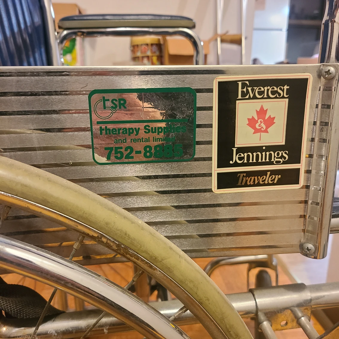 Good used condition. Blue leather upholstery, metal tubing. Includes detachable foot rests. 20" wide, 37" tall, 32" from back wheel to front wheel. Open to reasonable offers! Feel free to make an offer. Pick up at Spadina Ave/Cecil St