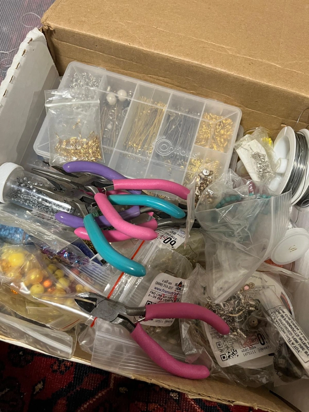 Kit includes: all pliers in photo, two storage containers, embroidery beads, charms, thing to make earrings, pins, other beads, all zebra wires Happy to pass this on to someone who wants to pass the time with this hobby!