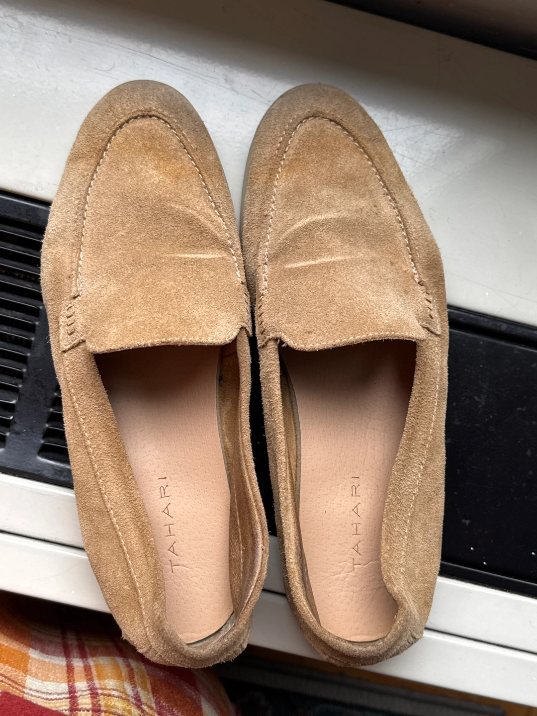 Selling a pair of Tahari loafers in a soft suede material. These are perfect for a casual yet stylish look. They show some signs of wear but are still in good condition and ready for a new home