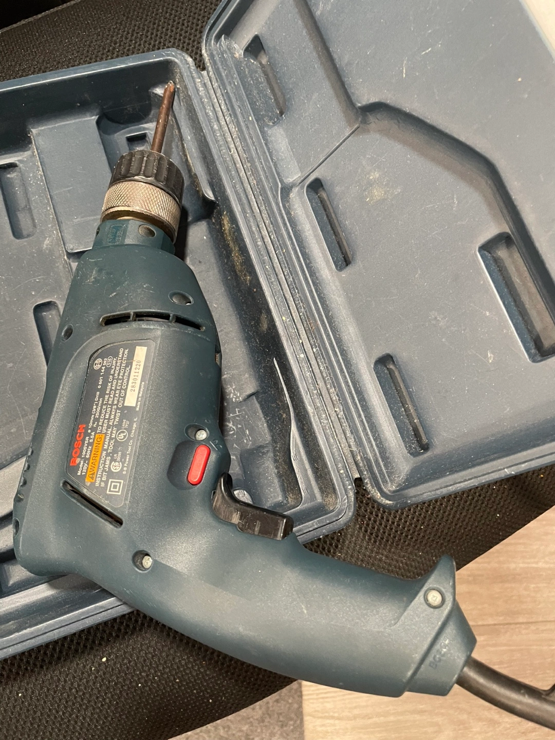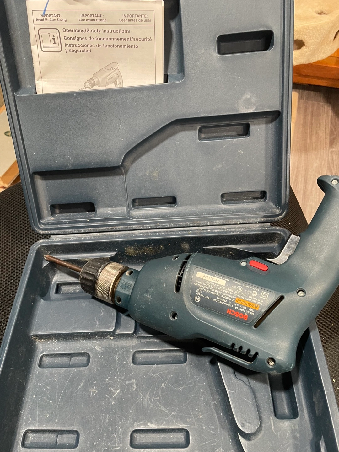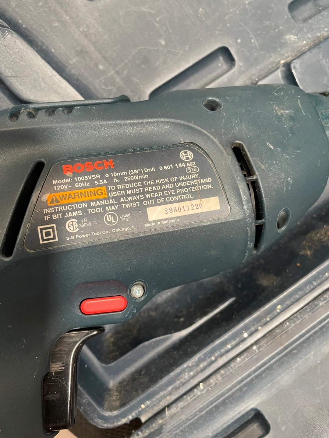 Selling a used Bosch 1005VSR 10mm (3/8") Corded Drill. It comes with its original case and Philips head bit. Runs well The drill operates at 120V~ 60Hz 5.5A and 0 to 2500/min. Please refer to the instruction manual for safety information.