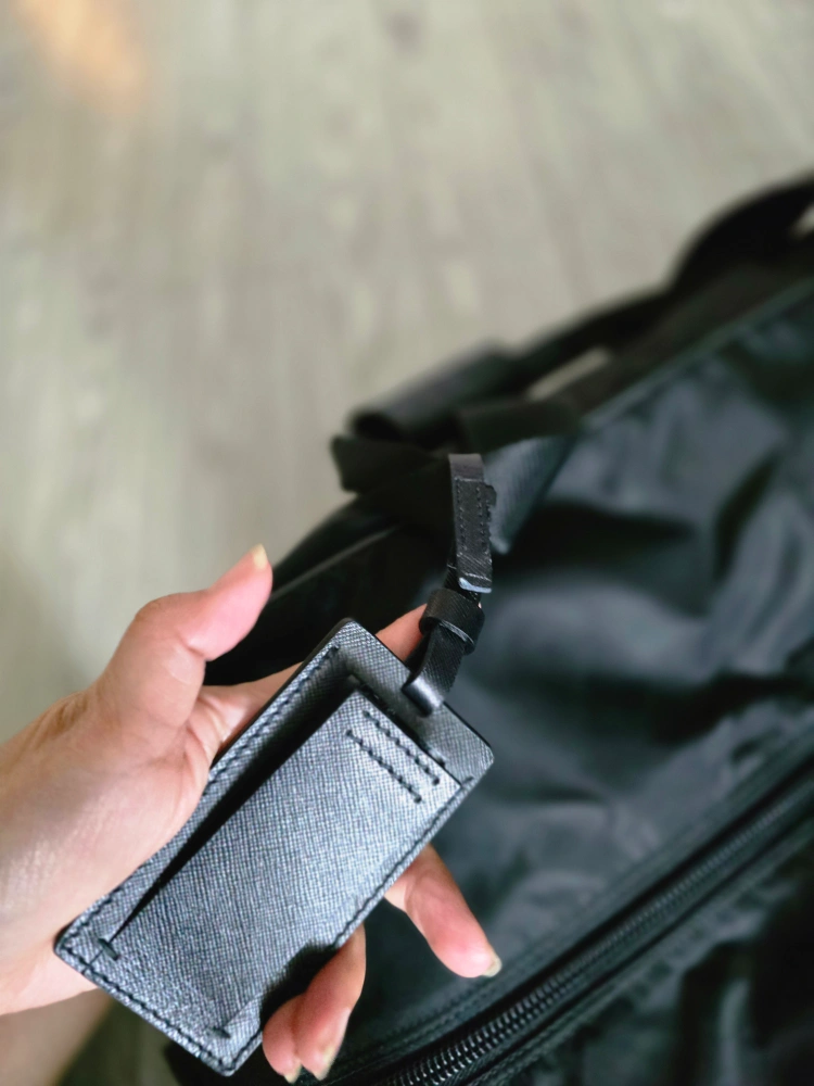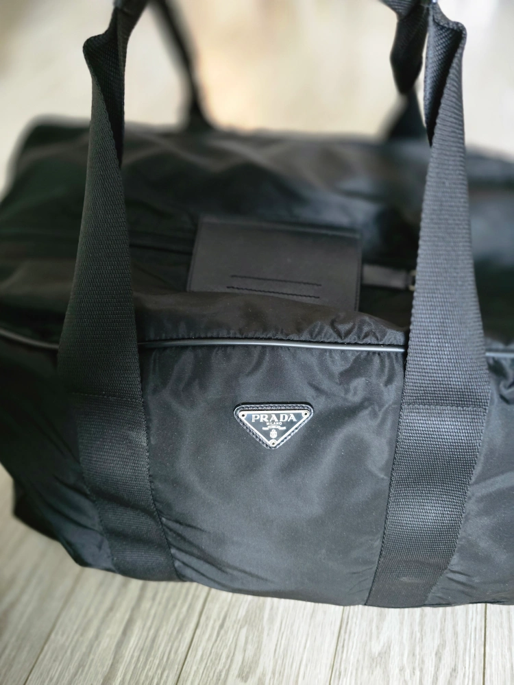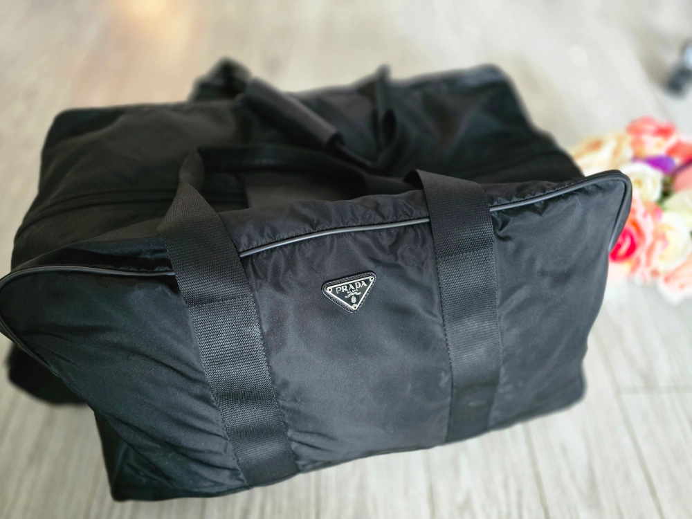 Here's a stylish Prada duffel bag, perfect for your travels! It's in great condition and ready for a new home. The classic black colour ensures it will match any outfit or luggage set. It's a great size for weekend getaways. Length: approx. 35 cm