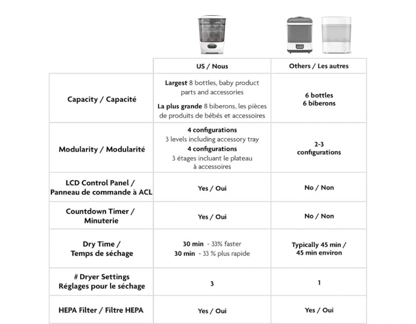 Automatically sterilizes & dries 33% faster bottles, baby product parts, pacifiers, teethers, sippy cups and other accessories from any brand in 1 easy step, saving you time