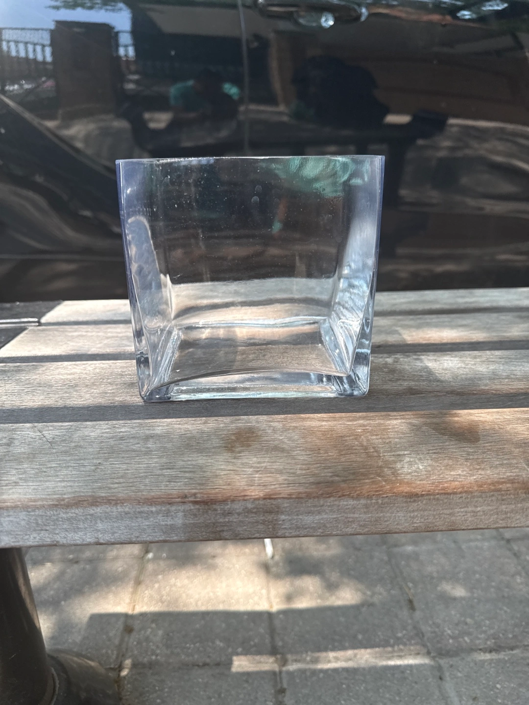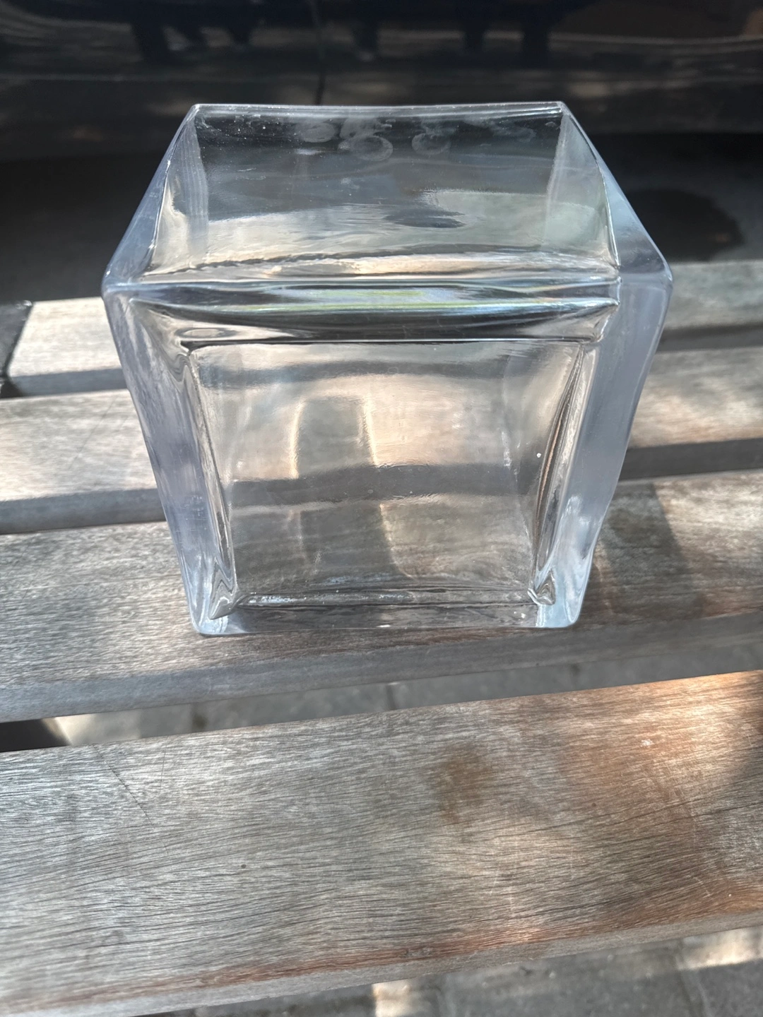 Selling a clear glass cube vase. It's in great condition and ready for your favourite floral arrangements or decorative displays! Perfect for adding a modern touch to any room ~ Great for big bundle flower arrangements or short stemmed.