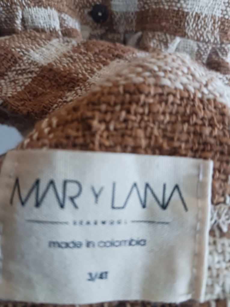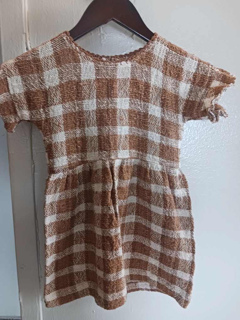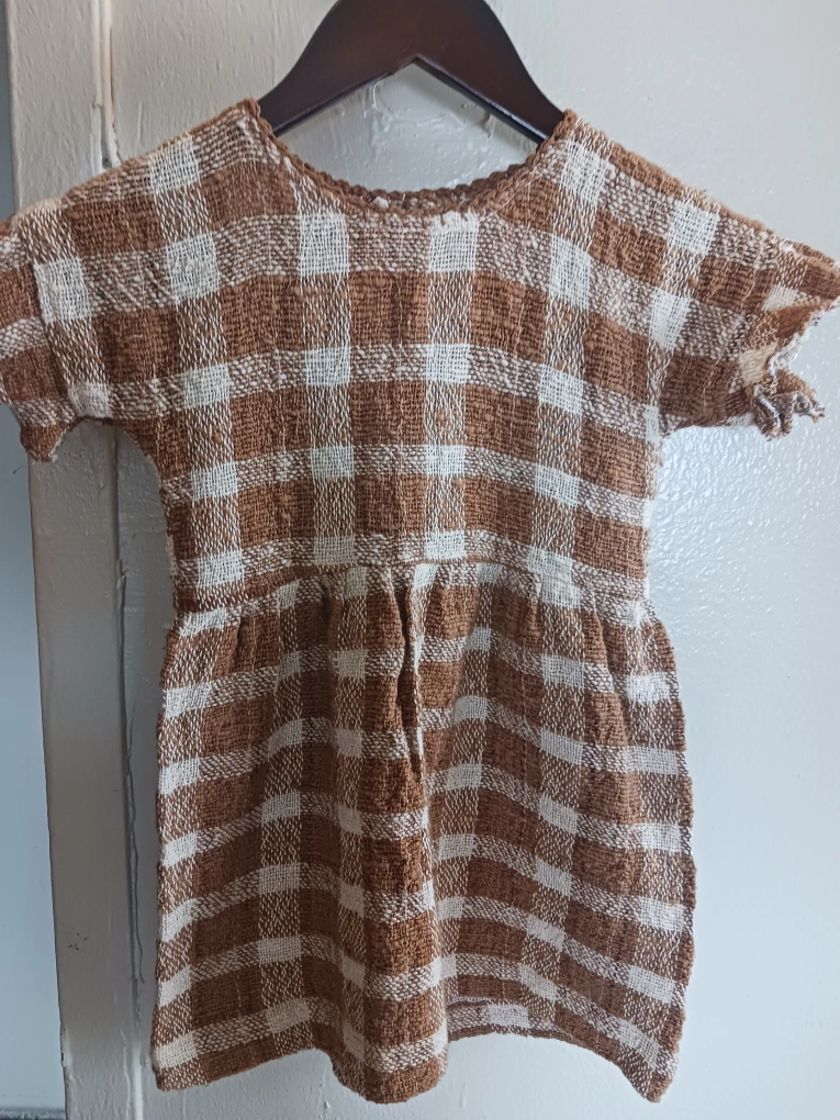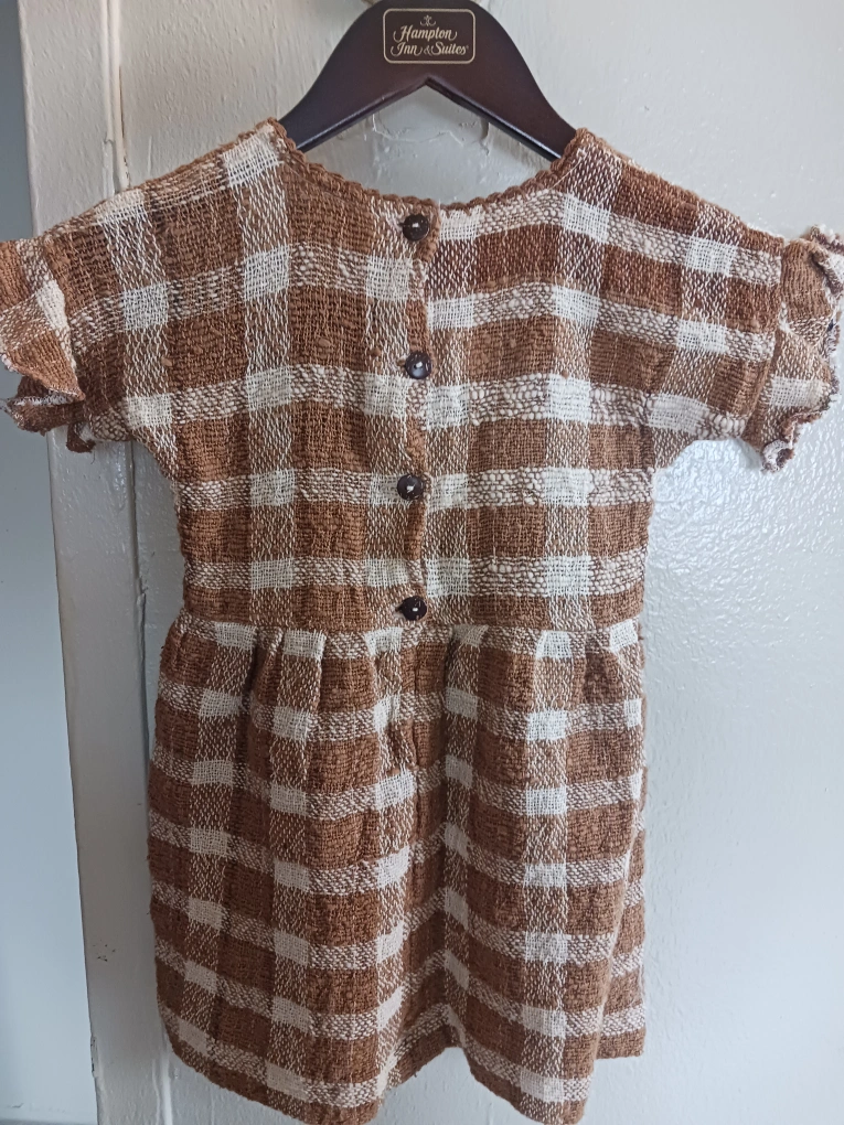 Here's a cute Marylana dress in size 3/4T! It features a brown and white plaid pattern. The dress is made in Colombia and has a unique woven texture.