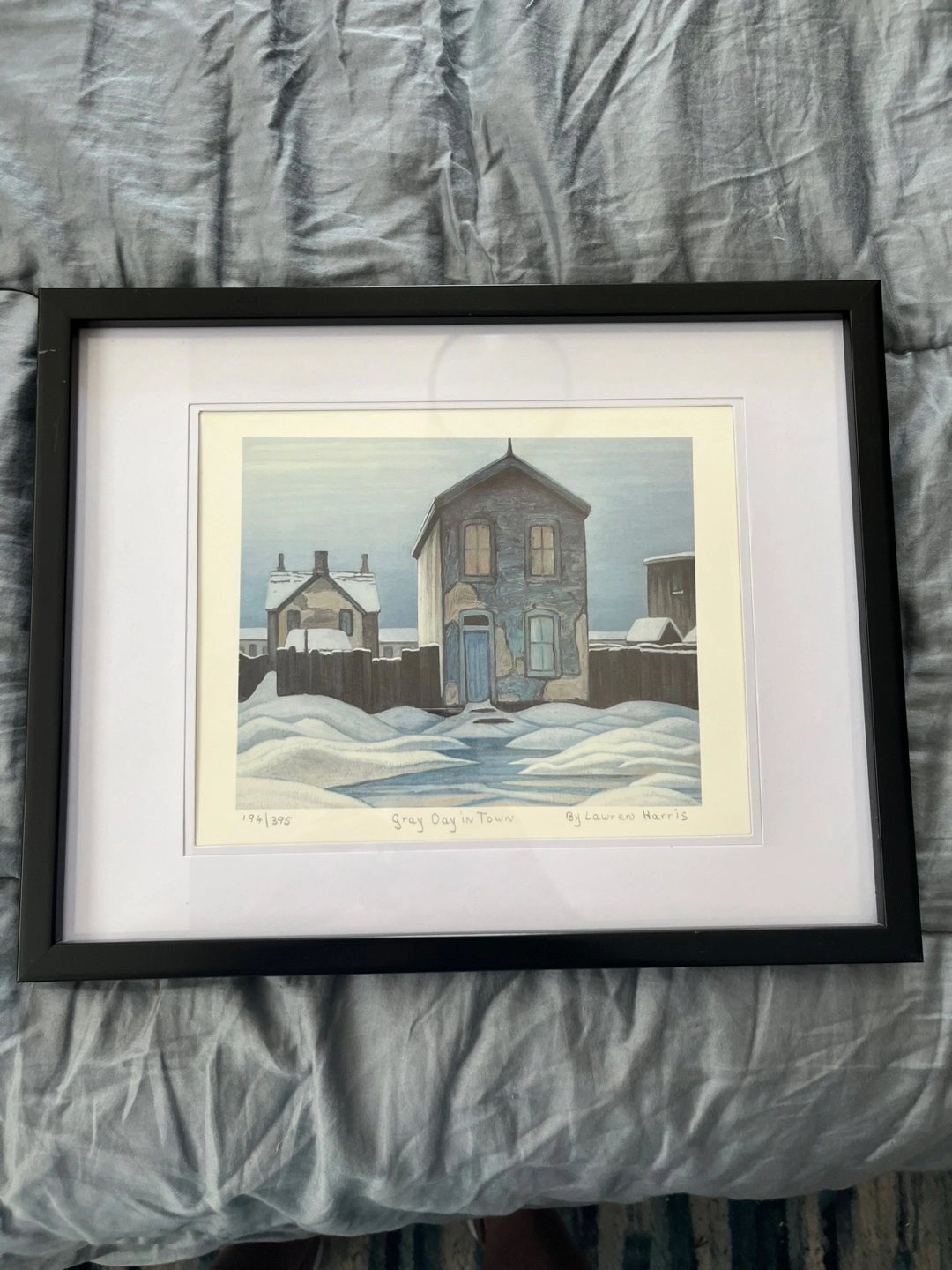 Here's a framed print of "Gray Day in Town" by Lawrence Harris. It's a fine art reproduction from Group of Seven Publishing. This piece is numbered 194/395 and comes with a certificate of authenticity