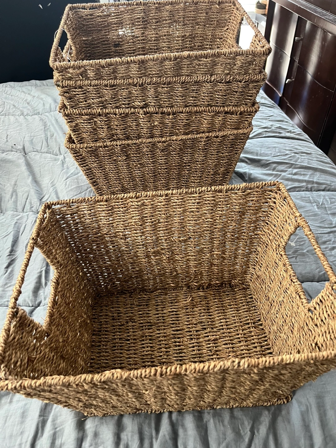 Selling a set of 5 woven storage baskets! They're in great shape and perfect for organizing your home. These baskets are sturdy and have convenient handles for easy carrying. They would look great in any room!
